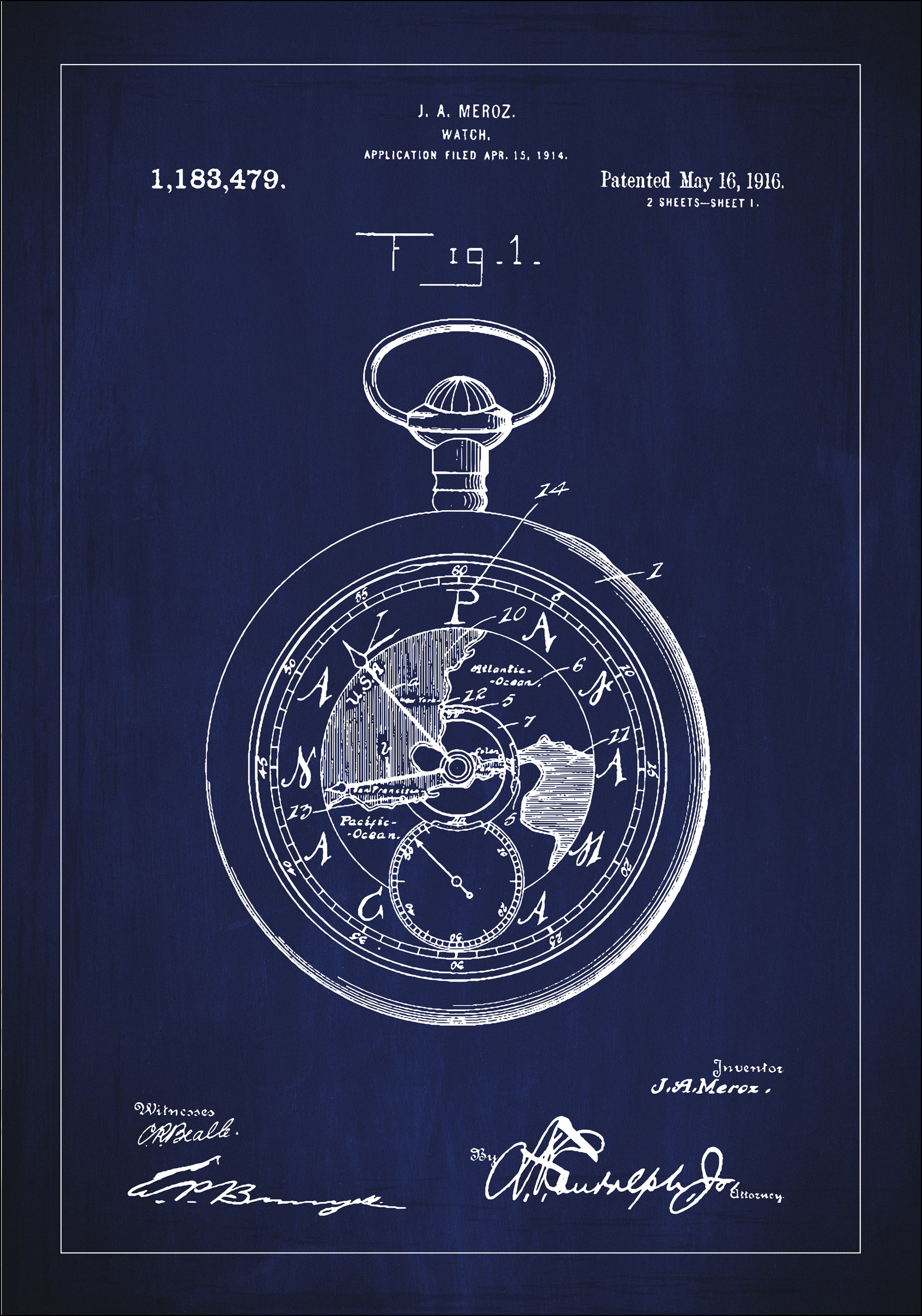 Utforska historiens uppfinningsrikedom med vår exklusiva patentposter som skildrar en klassisk tidmätare. Denna autentiska patentritning, ursprungligen inlämnad den 15 april 1914 och beviljad patentnummer 1,183,479 den 16 maj 1916, framhäver den tidlösa innovationen av J.A. Meroz. Dess noggranna detaljer och tekniska skisser ger en unik inblick i armbandsurets tidiga utveckling. Denna patent affisch kombinerar industrihistoria med elegant design och blir en perfekt konversationsstartare för alla som uppskattar mekanisk design och historiska dokument.