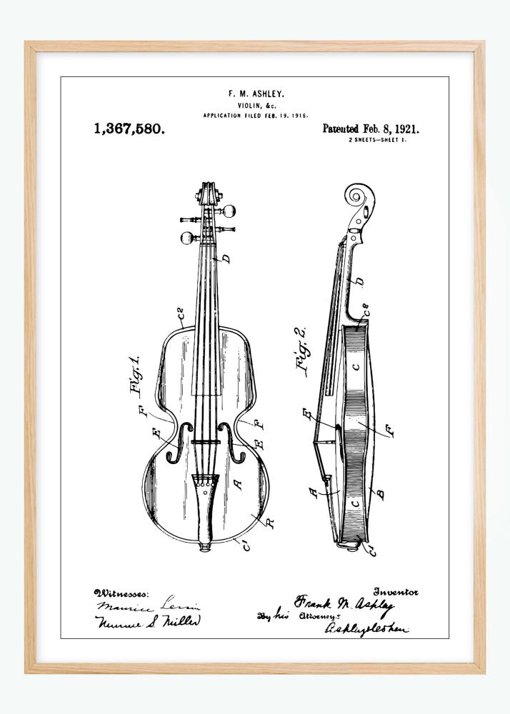 Denna elegant utformade patentposter presenterar en klassisk uppfinning, en violin, från det amerikanska patentet 1,367,580. Patentet beviljades den 8 februari 1921 till uppfinnaren F. M. Ashley, vars namnteckning ger en personlig touch till detta historiska dokument. Med sitt traditionella och tidlösa utseende är denna patentritning en hyllning till musikens och hantverkets värld.