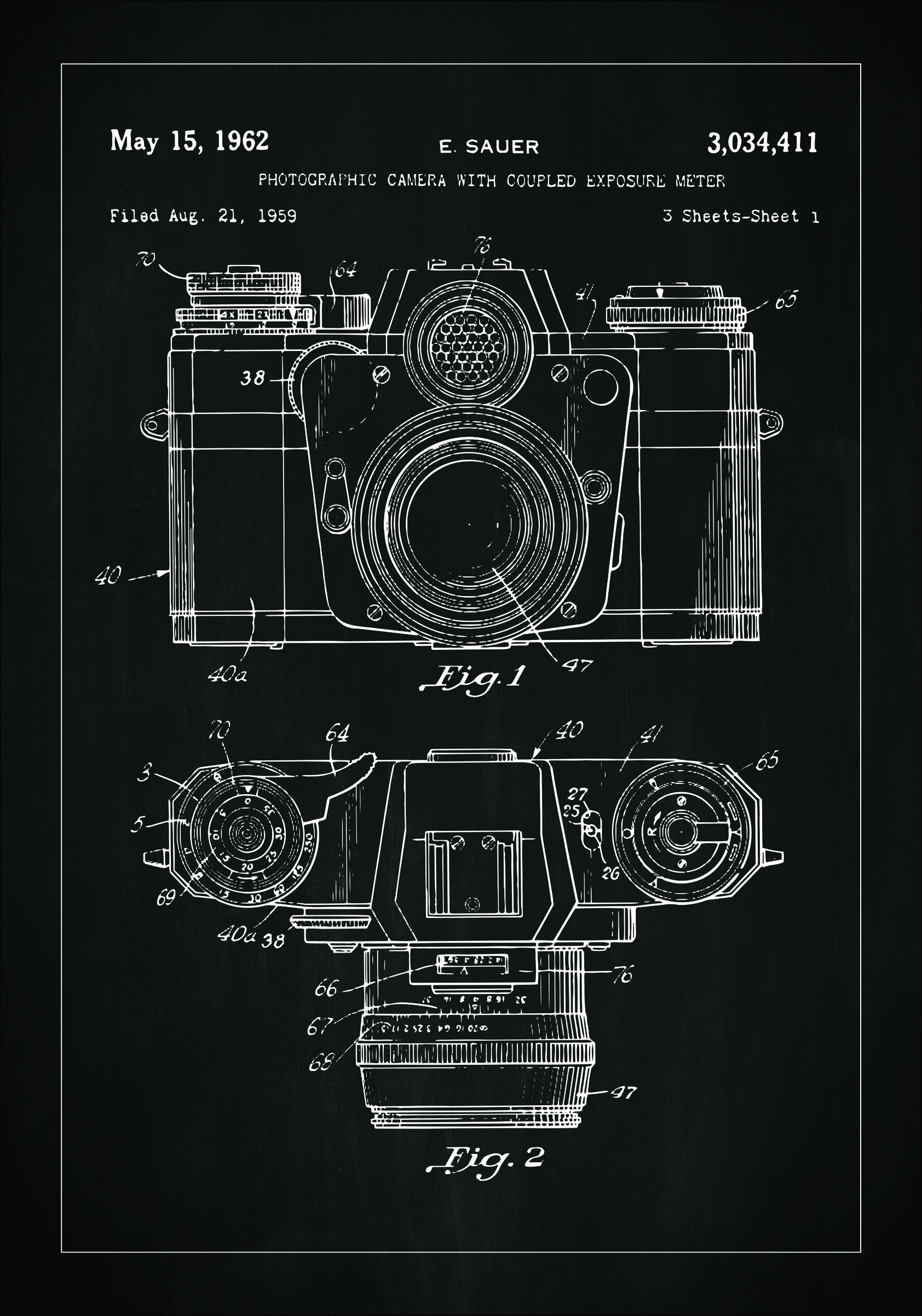 Denna patentposter framställer en fotokamera med en kopplad exponeringsmätare, som erhöll patent den 15 maj 1962 under nummer 3,034,411. Uppfinnaren, E. Sauer, lämnade in patentet den 21 augusti 1959. Den detaljerade ritningen visar kamerans framsida och överkropp i en frontvy samt ett nedre perspektiv som visar kamerans bas och objektivet. Den tekniska precisionen och den genomtänkta designen som framträder i dessa illustrationer återspeglar en epok av fotografisk innovation och kreativitet.
