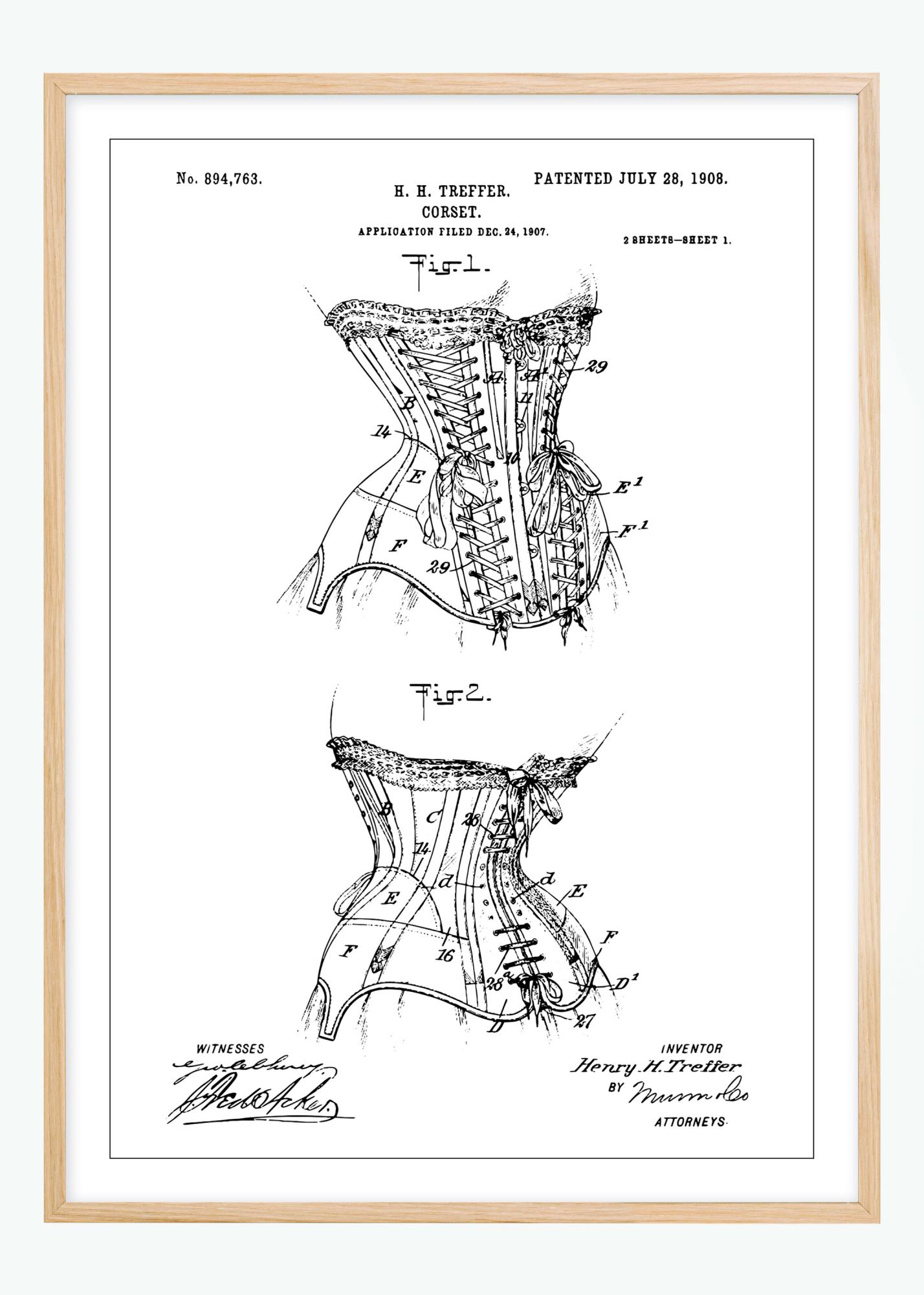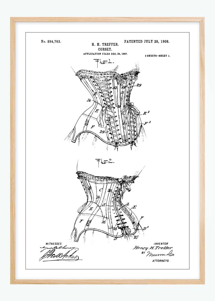 Pryd din vägg med en snygg patentritning av den berömda korsetten! Denna affisch blir garanterat ett fint inslag i interiören, speciellt om du har diverse vintageprylar att matcha med. Ritningen föreställer korsetten visad fram- och bakifrån med välgjorda detaljer. Upptill finns spännande information i form av bland annat upphovsmannen Henry Treffers namn, datumet då ritningen lämnades in, datumet då patentet godkändes samt vilket nummer det tilldelades. Längst ner hittar du upphovsmannens namn tillsammans med underskrifter från vittnen och en advokat. Runt motivet löper en tunn, svart linje. Eftersom planschen finns i flera olika utföranden hittar du enkelt en som passar i just ditt hem. Komplettera gärna med en ram från vårt stora sortiment!