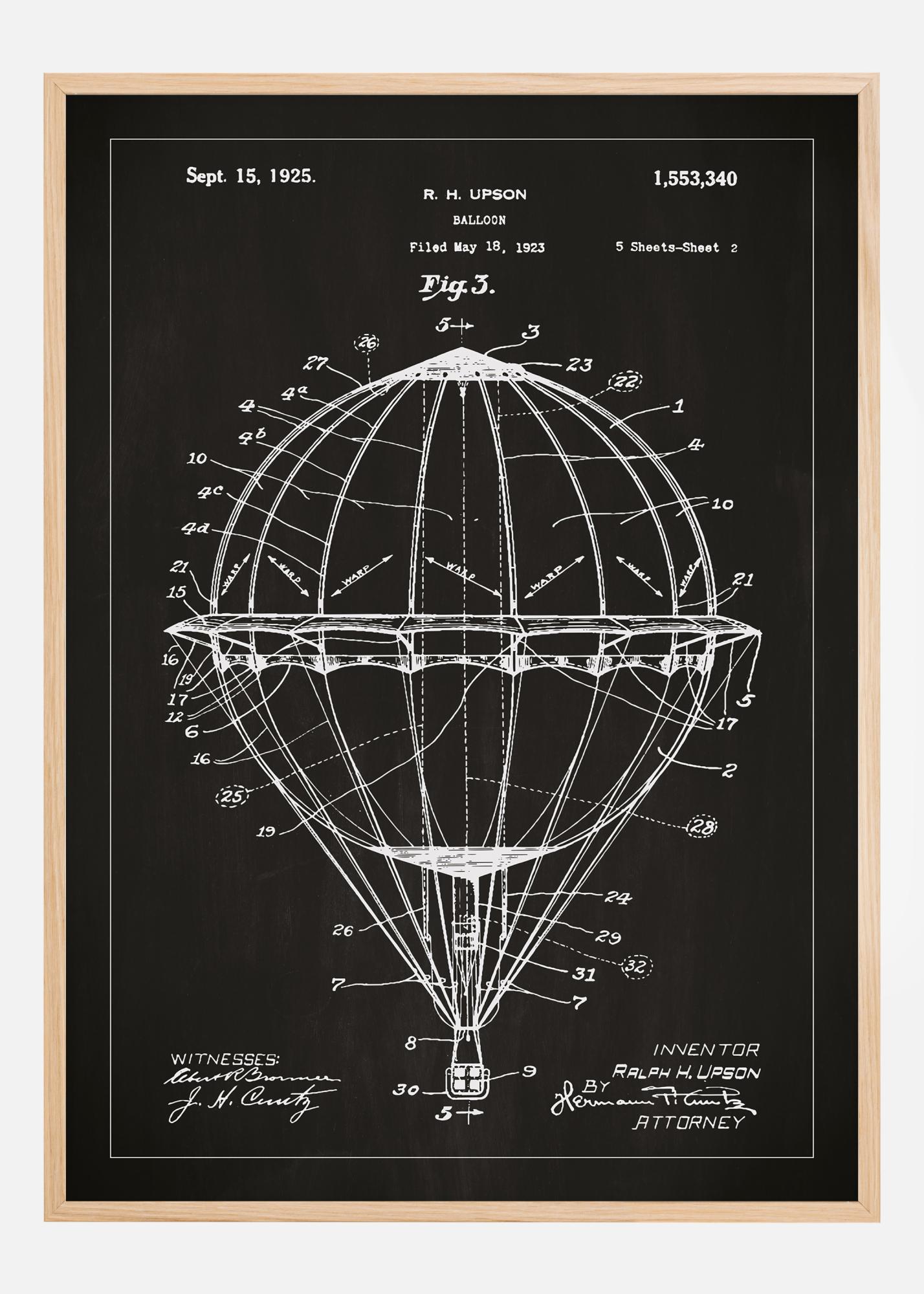 Denna unikt framställda patentposter illustrerar en detaljerad konstruktion av en luftballong, vars originalpatent skapades av innovatören Ralph H. Upson. Patenterad den 15 september 1925 under nummer 1,553,340, är detta ett fascinerande exempel på tidig aerodynamisk ingenjörskonst. Denna patent affisch är en hyllning till drömmen om att sväva bland molnen och mänsklighetens strävan efter att utforska himlen.