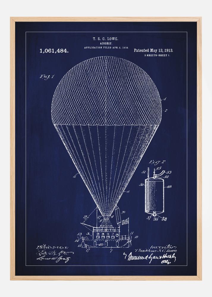 Med stolthet presenterar vi denna patentposter som skildrar T. S. Lowe's luftskepp, en uppfinning som markerade ett framsteg i tidig luftfart. Patentet, med nummer 1,061,484, beviljades den 13 maj 1913 och bär med sig en tid av äventyr och innovation. Denna affisch är en tribute till det tidiga 1900-talets kreativa anda och tekniska drömmar.