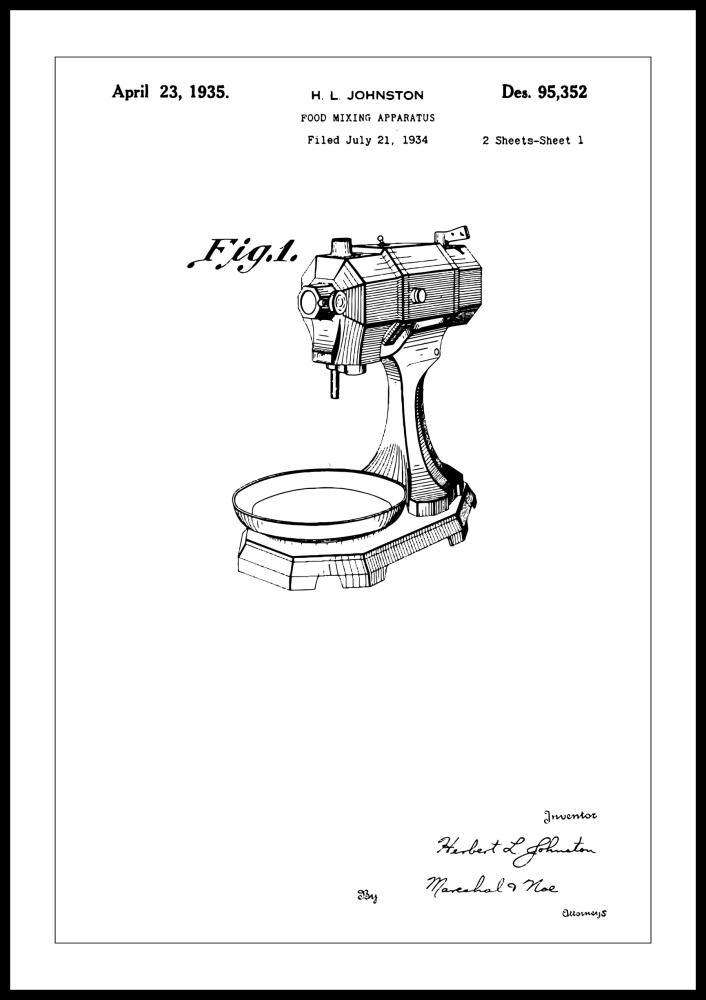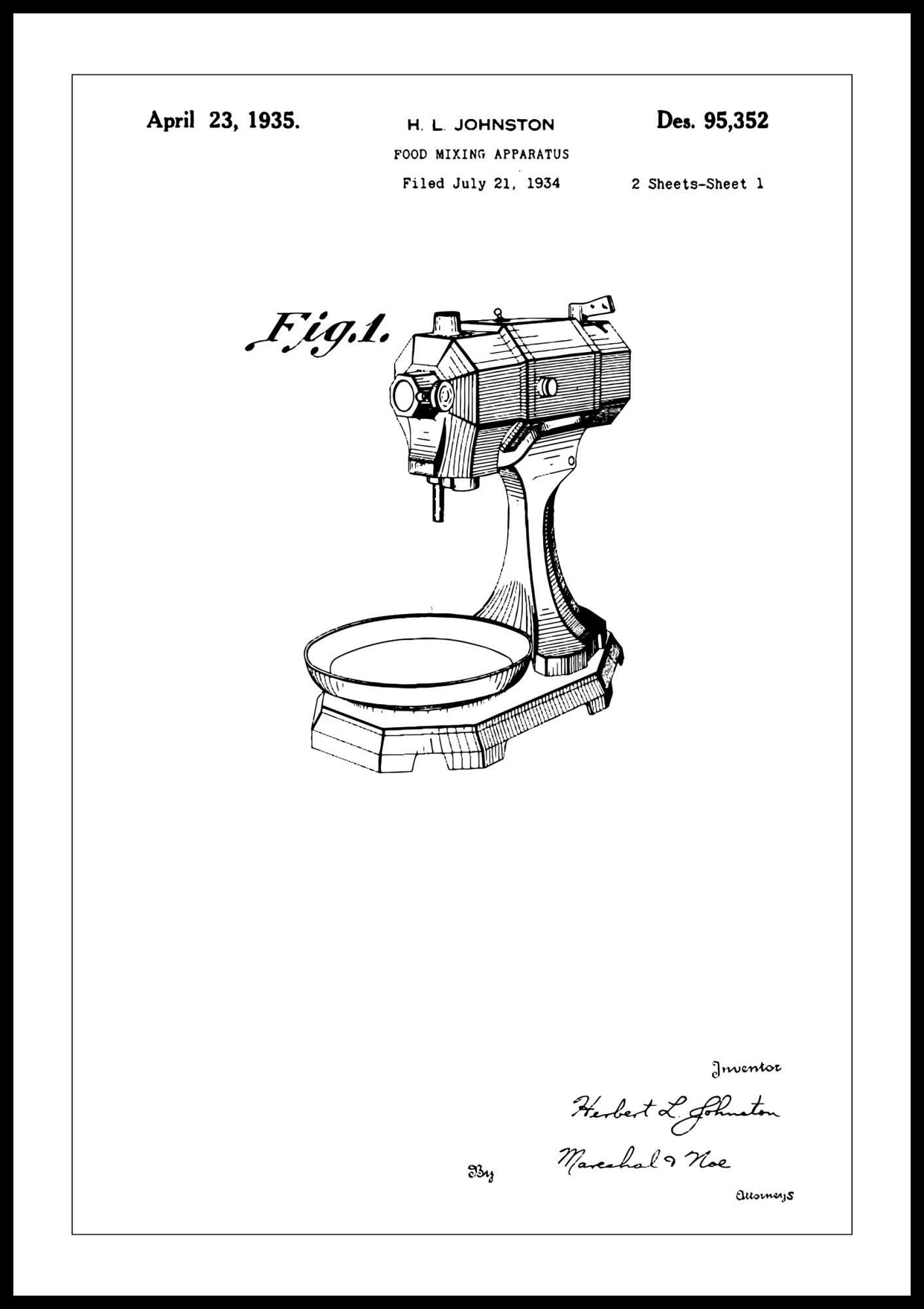 Skapa en hemtrevlig känsla i köket med diverse snygga vintageprylar! Denna eleganta poster föreställer en mixer som den såg ut på 30-talet. Upptill finns spännande information i form av datumet då patentritningen lämnades in, dagen då patentet beviljades och upphovsmannens namn. Längst ner i motivet kan du se uppfinnaren Herbert L. Johnstons signatur tillsammans med en underskrift från en advokat. Modellen hade en för den tiden modern design som underlättade i många välbeställda familjers hem. Detta är nummer 1 av 2 stycken ritningar som hör till patentet. Postern finns i en rad olika format så du kan vara säker på att du hittar en som passar i just ditt kök. Komplettera gärna med nummer 2 för en fin tavelserie!