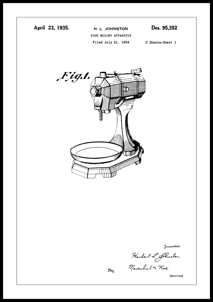 Skapa en hemtrevlig känsla i köket med diverse snygga vintageprylar! Denna eleganta poster föreställer en mixer som den såg ut på 30-talet. Upptill finns spännande information i form av datumet då patentritningen lämnades in, dagen då patentet beviljades och upphovsmannens namn. Längst ner i motivet kan du se uppfinnaren Herbert L. Johnstons signatur tillsammans med en underskrift från en advokat. Modellen hade en för den tiden modern design som underlättade i många välbeställda familjers hem. Detta är nummer 1 av 2 stycken ritningar som hör till patentet. Postern finns i en rad olika format så du kan vara säker på att du hittar en som passar i just ditt kök. Komplettera gärna med nummer 2 för en fin tavelserie!