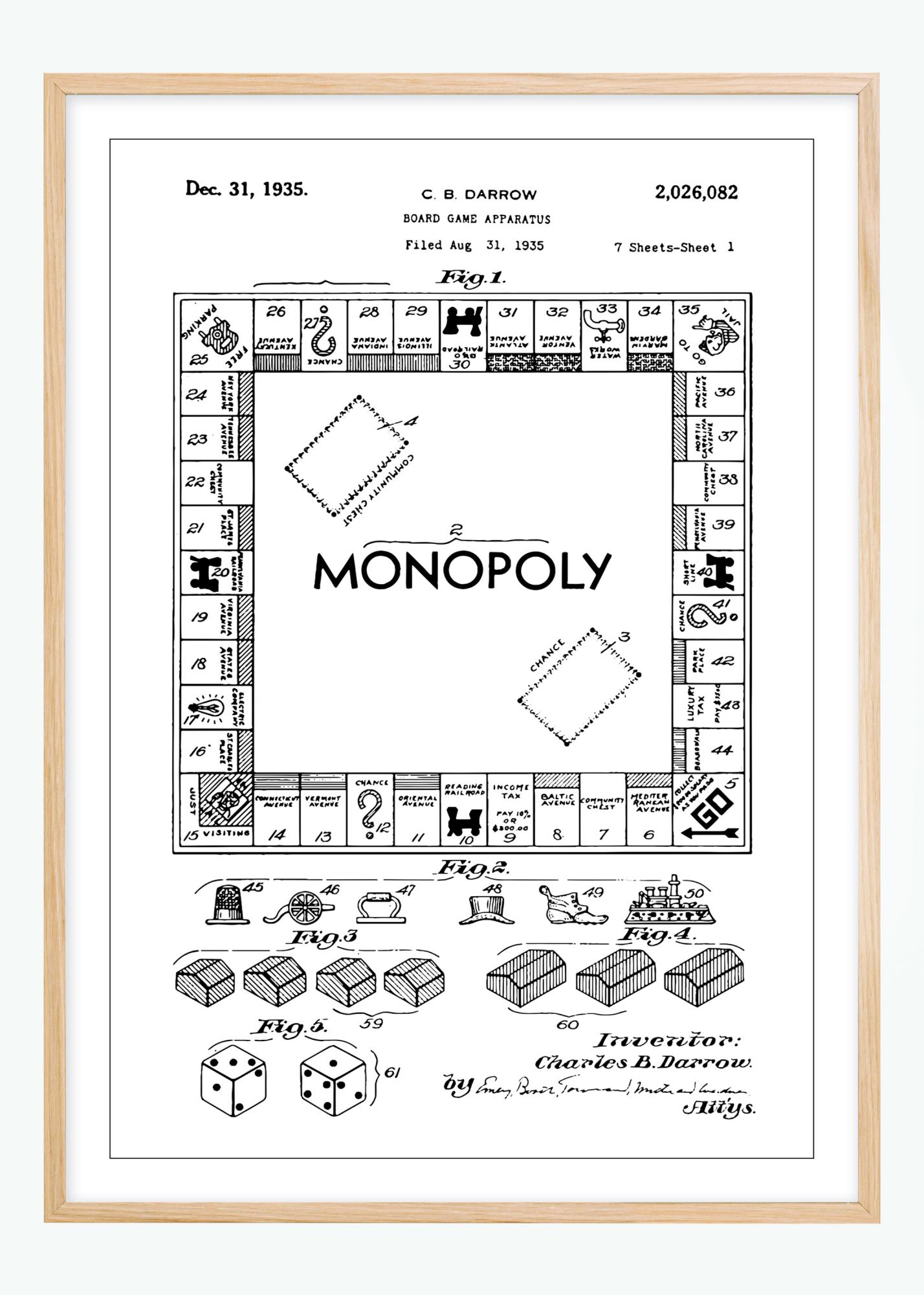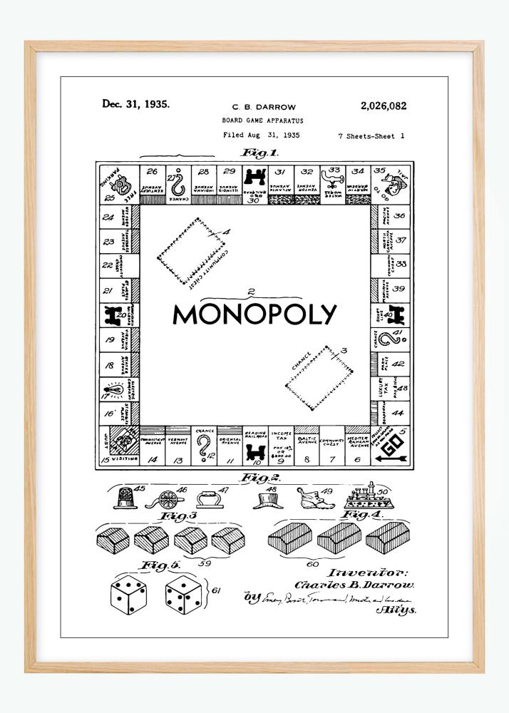 Denna patentaffisch skildrar den klassiska designen av det älskade sällskapsspelet Monopoly, ett kulturellt ikon inom familjeunderhållning och spel. Datumen visar att uppfinnaren Charles B. Darrow ansökte om patentet den 31 augusti 1935, och det beviljades den 31 december samma år med nummer 2,026,082. Den detaljerade ritningen presenterar en översikt av spelplanen, komplett med de välkända "gå", "chans" och egendomsrutorna, samt de ikoniska spelpjäserna och tärningarna, vilket ger en nostalgisk känsla och uppskattning för detta tidlösa spel.