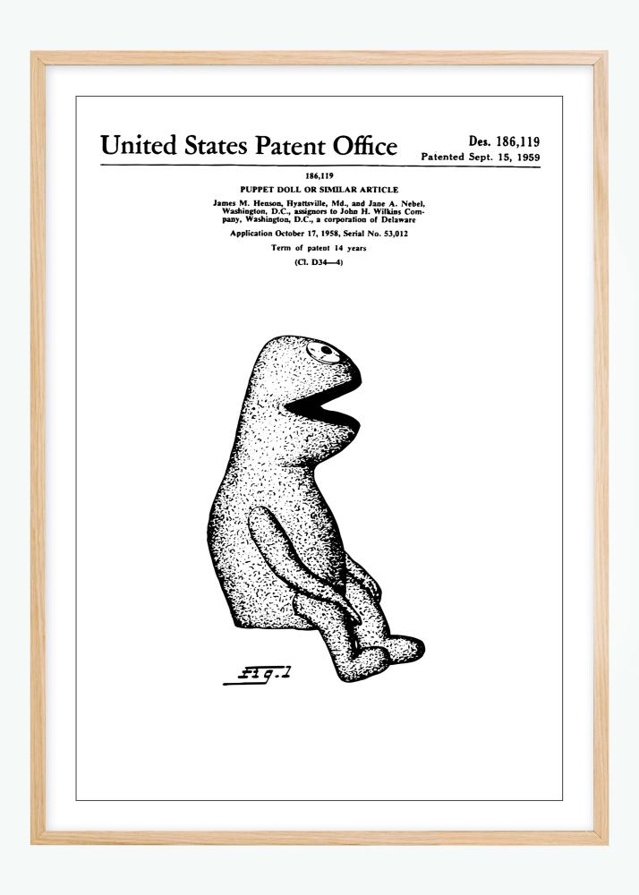 Denna patentposter återger designen av Kermit, ett stycke leksaksinnovation som blev officiellt dokumenterat den 15 september 1959 under patentnummer Des. 186,119. Den avbildade figuren visar en enskild sidovy av dockan, som med sin distinkta och karismatiska form erbjuder en glimt in i leksaksdesign under mitten av 1900-talet. Detta var en tid då design och kreativitet började få större betydelse inom leksaksindustrin, vilket denna docka är ett exempel på.