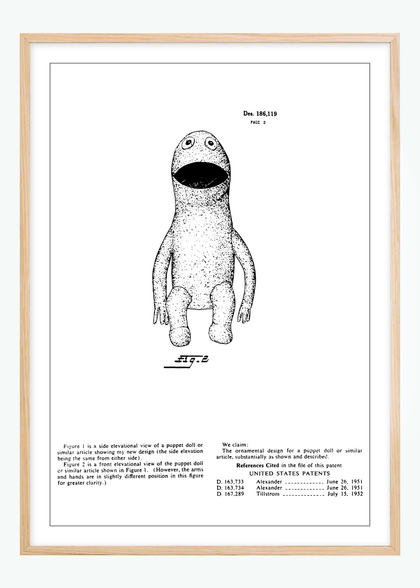 Den här patentaffischen visar en leksak på Kermit. Med patentnummer Des. 186,119 är den här illustrationen en officiell dokumentation av en docka med en charmig och ovanlig estetik. Figuren på ritningen erbjuder en fullständig frontvy, vilket framhäver dockans detaljer och form, och ger en känsla av karaktär och personlighet som kan uppskattas av både barn och vuxna.