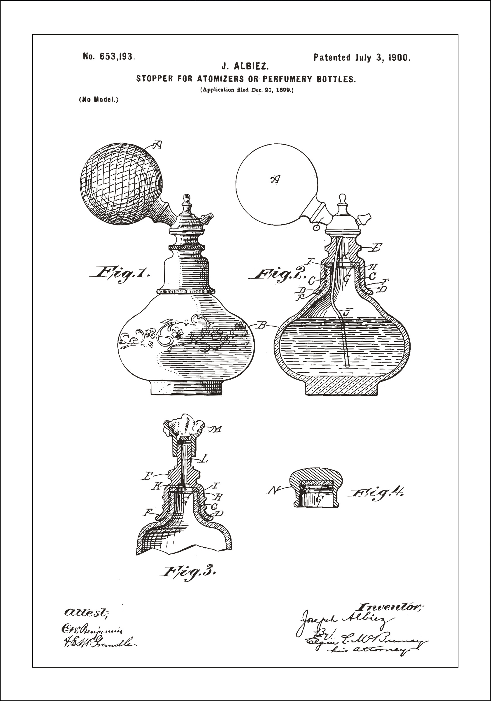 Har du tänkt på vad mysigt det ser ut i Disneyfilmer när Mimmi Pigg eller Kajsa Anka sprutar på sig parfym old school med hjälp av en liten pump som sitter på parfymflaskan? Här har vi patentritningen av en sådan chramig flaska, inlämnad i USA i juli år 1900! Välj mellan 3 fina färger och en massa olika storlekar.