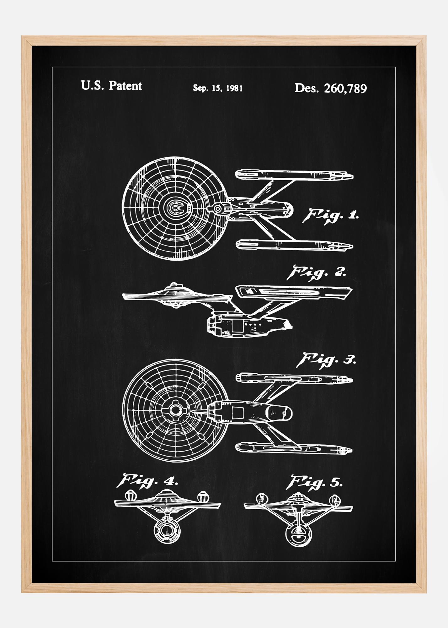 Denna patentposter presenterar ett ikoniskt designkoncept för rymdfarkosten Enterprice från Star Trek, daterad den 15 september 1981 med patentnummer Des. 260,789. Det är en stiliserad skildring som för tankarna till science fiction-äventyr och interstellära resor. De detaljerade illustrationerna återger farkostens form från olika vinklar och perspektiv, vilket lyfter fram både dess symmetri och dess komplexa strukturer. Denna patentritning kombinerar vetenskapligt under och estetiskt nöje, och den är en utmärkt konversationsskapare som tillför ett inslag av nyskapande och framtidstro till vilken miljö som helst.