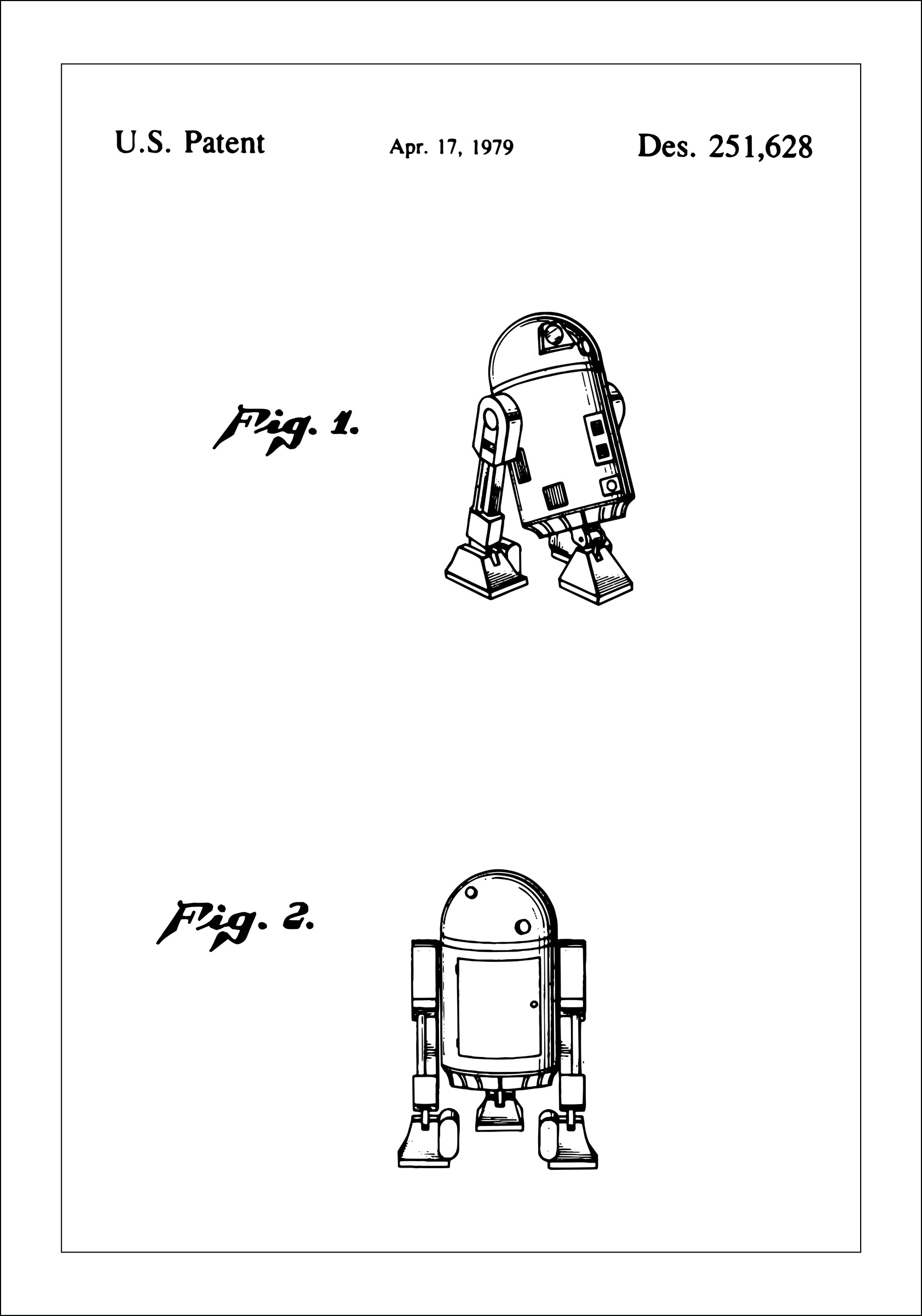 Denna fascinerande patentposter fångar essensen av retrofuturism med en design för en R2D2 från StarWars, vilket reflekterar periodens visionära blick mot framtidens teknologi. Med ett amerikanskt patent daterat den 17 april 1979, under registreringsnummer Des. 251,628, illustrerar detta motiv två perspektiv av en ikonisk robotfigur, en fullständig profil och en frontvy. Det är en tidlös patentritning som både är en hyllning till och en dokumentation av det sena 1900-talets framsteg inom robotteknik och dess inflytande i populärkulturen.