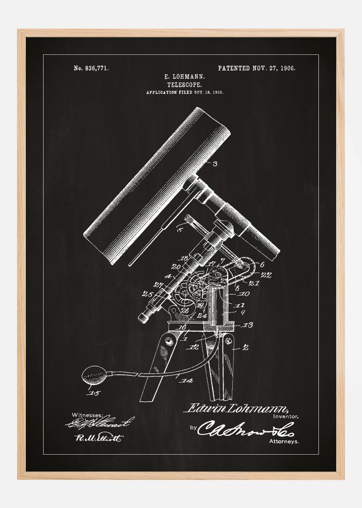 Denna detaljerade patentposter framställer E. Lohmanns teleskop, patenterat den 27 november 1906, med patentnummer 836,771. Illustrationen fångar teleskopets komplexa mekanik och finmekaniska detaljer med omsorgsfull precision. Posterens djärva kontrast mellan de intrikata linjerna och den mörka bakgrunden gör den till en iögonfallande inredningsdetalj som samtidigt hedrar astronomin och optikens rika historia. Det är en fascinerande hyllning till den tidiga 1900-talets vetenskapliga framsteg och en inspirerande blickpunkt för alla vetenskapsentusiaster.