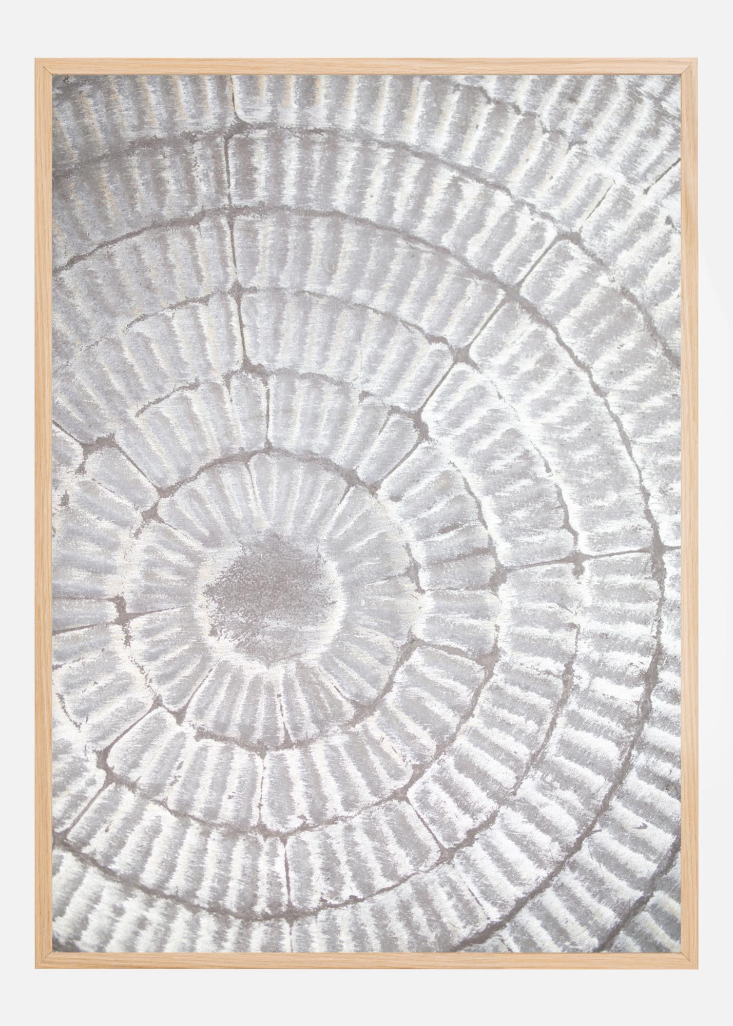 En glasartad poster med en grå mönsterplatta. De cirkulära beige och vita ringarna skapar ett ribbat utseende på plattan som bildar en perfekt slät cirkel i mitten. Med sina mjuka lugnande färger skapar de här härliga bilden en fridfull mystik. Perfekt att hänga på en färgstark vägg.