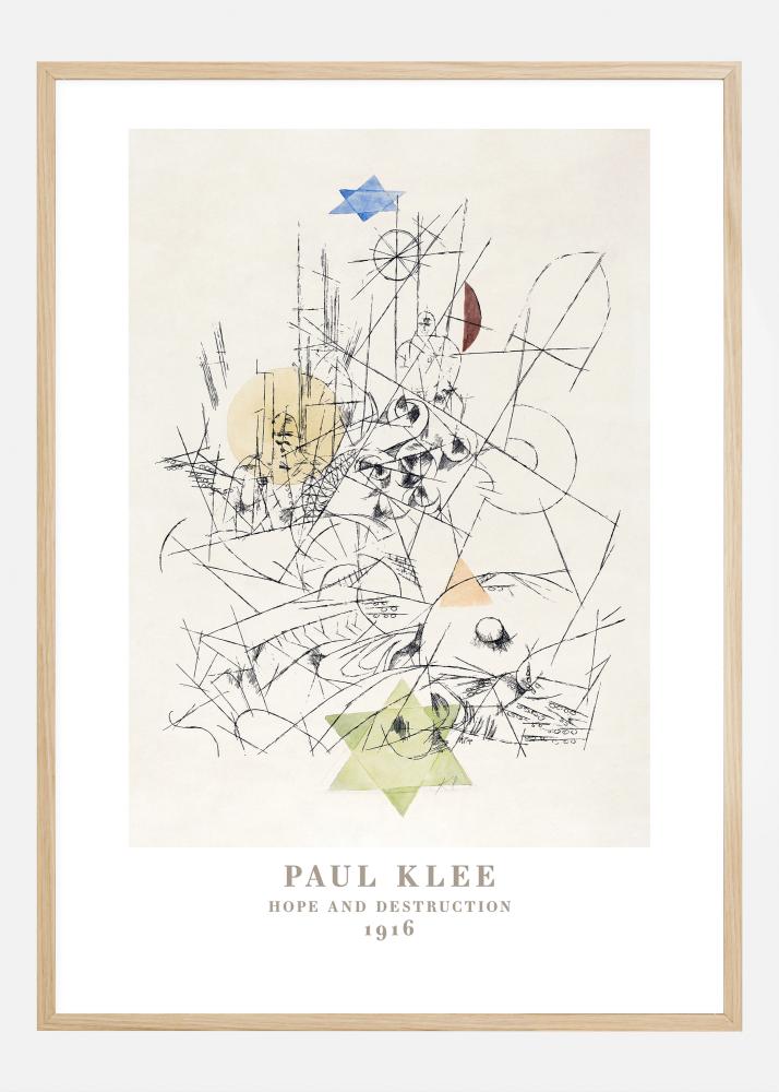 Denna konstnärliga affisch avbildar ett verk av Paul Klee, betitlat "Hope and Destruction" från 1916, och fångar en unik kombination av abstrakt konst och symbolik som är karakteristisk för Klees stil. Motivet är rikt med linjer och former som samspelar över kompositionens yta, vilket ger en känsla av både ordning och kaos. Det är en print som skulle kunna tilltala de som uppskattar både modern och samtida konst, idealisk för att lägga till en tankeväckande dimension till varje rum eller kontor.