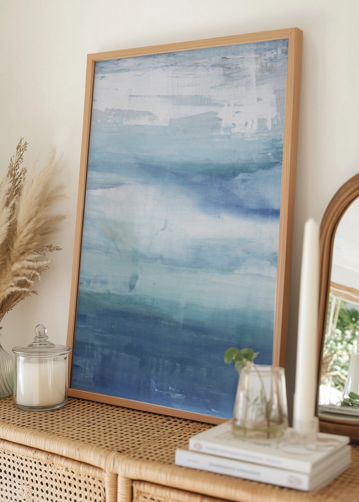 Denna poster fångar ögat med sina lugnande blå toner och skiftande nyanser av turkos och aquamarin. Det abstrakta konstverket ger en känsla av djup och mystik, vilket gör det till en perfekt dekoration för alla rum där harmoni och modern stil är önskvärda. De mjuka övergångarna mellan färgerna skapar en rofylld atmosfär, samtidigt som den upplyftande ljusblåa färgen tillför en känsla av friskhet.