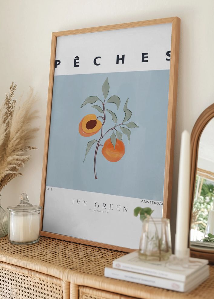 Färgerna i motivet inkluderar ljusblå, grön, orange och brun, vilket gör denna affisch lätt att matcha med olika inredningsstilar. Över motivet står texten "PÊCHES" i en stilfull typografi som ger en modern touch till den klassiska känslan. Denna poster blir ett attraktivt tillskott till vilket rum som helst och kan enkelt kombineras med andra prints för en personlig gallerivägg.