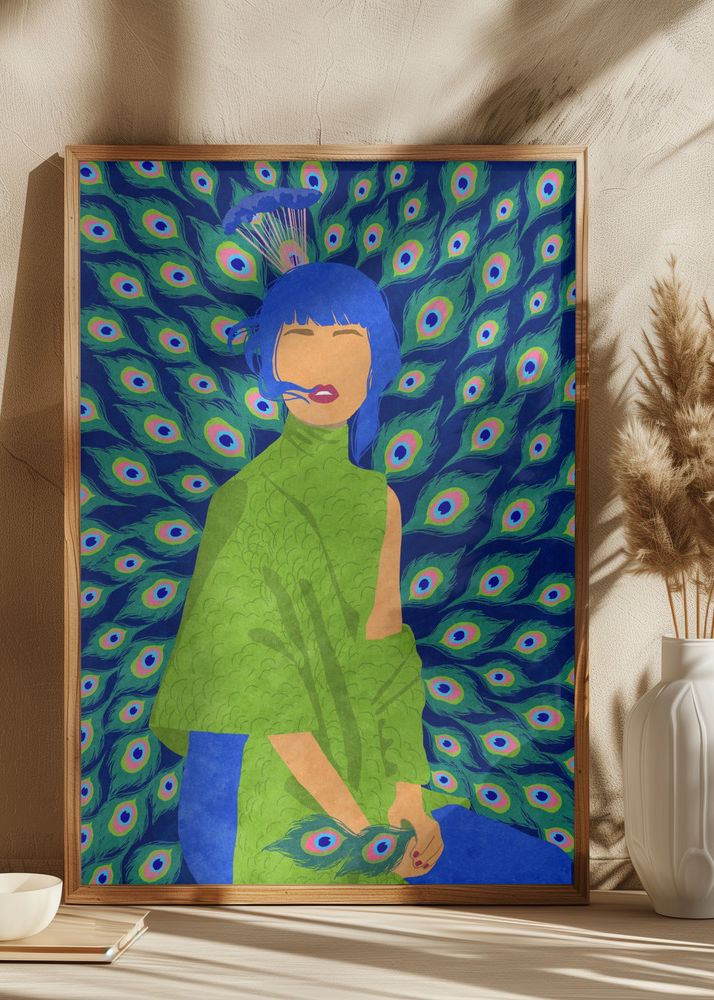 Denna livfulla poster fångar ögat med sina intensiva och kontrasterande färger. Centralt i motivet står en stiliserad person draperad i gröna nyanser, omgiven av en överdådig bakgrund som påminner om påfågelns imponerande fjäderskrud. Den djupa blå färgen skapar en dramatisk och elegant inramning, medan inslag av livfullt blått och grönt ger djup och dimension.
