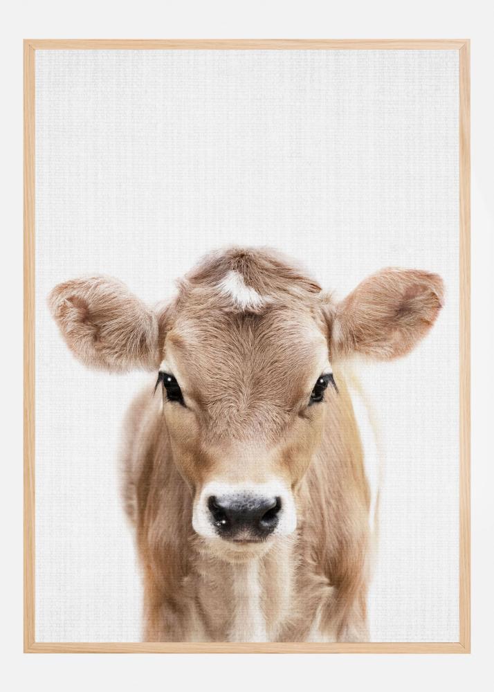 Skapa en charmig och vänlig atmosfär i ditt hem med denna bedårande poster av en kalv. Huvudmotivet i bilden är en söt kalv med stora ögon som omedelbart drar betraktarens uppmärksamhet. Djurets varma, bruna päls har nyanser av både ljusare beige och mörkare brun, vilket ger en naturlig och mjuk känsla till motivet. Kalvens vitaktiga nos och pannas lilla tofs är detaljer som ger liv och personlighet till printen.