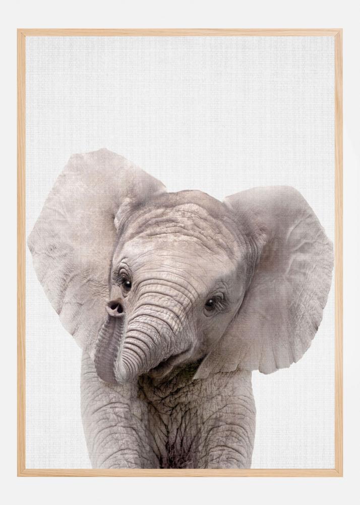 Denna charmiga poster föreställer en bedårande elefant i närbild, vars milda ögon och lena hudtextur återspeglar ett lugn och vänligt uttryck. Djurets stora öron och mjuka linjer adderar en känsla av värme och närvaro till motivet, vilket gör det till en perfekt inredningsdetalj för alla som önskar föra in en bit av naturen i sina hem. Färgpaletten är mjuk och naturlig, bestående av nyanser av grått och beige, vilket gör att detta print enkelt kan integreras i olika inredningsstilar och färgscheman.