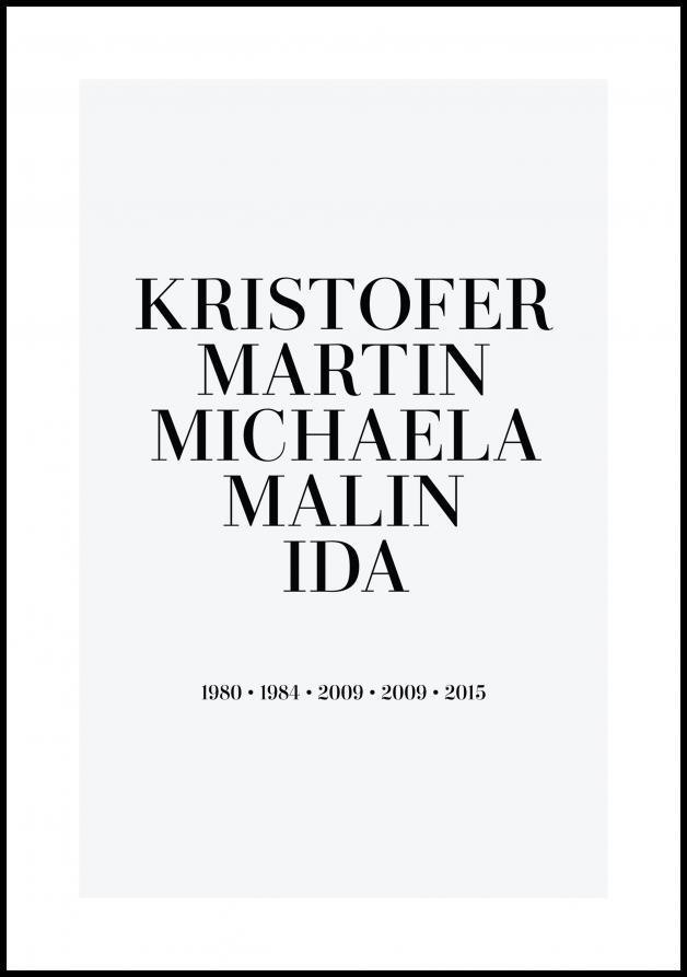 Snygga posters med eget tryck är en av våra absoluta favoritprodukter. Varför inte köpa hem en poster till föräldrarna, en affisch med familjens alla förnamn, ett årsplakat med hela familjens födelseår eller en poster med ert bröllopsdatum? Personligt, unikt och snyggt helt enkelt!