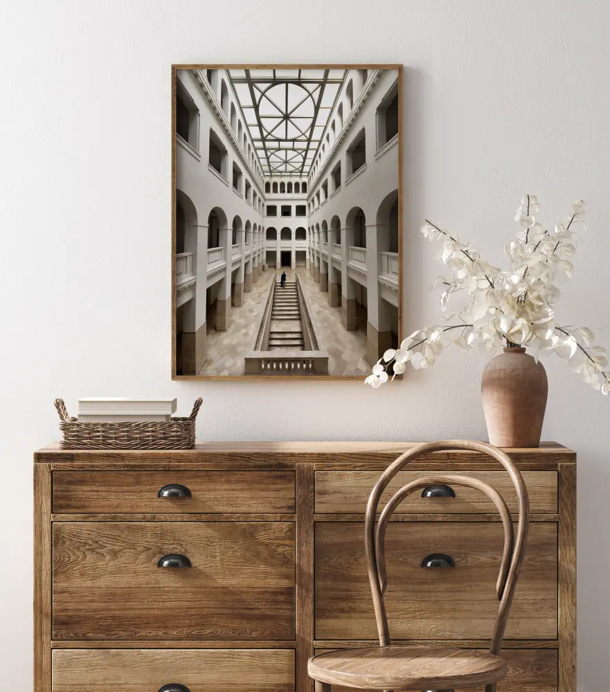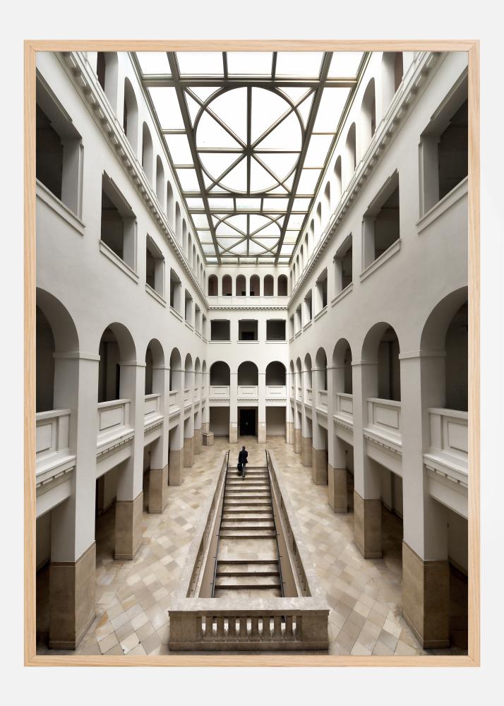 En magnifik poster med Peter Behrens byggnad. Den beige och vita inredningen fångar en figur som går uppför trapporna. Det genomskinliga taket belyser arkitekturens detaljer med cirkulära och fyrkantiga fönster som låter ljuset lysa igenom. Skapa en stilfull atmosfär med detta fantastiska tryck.