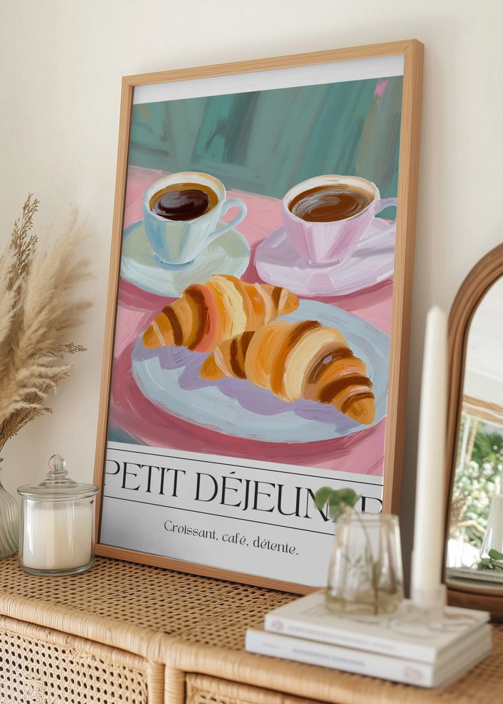 Färgpaletten inkluderar mjuka nyanser av rosa och grönt, med varma toner av brunt och beige som framhäver brödet och kaffet. Denna harmoniska kombination skapar en fridfull atmosfär och gör det enkelt för detta print att passa in i olika heminredningsstilar. Upplev känslan av ett petit déjeuner varje dag med denna eleganta och tidlösa design.