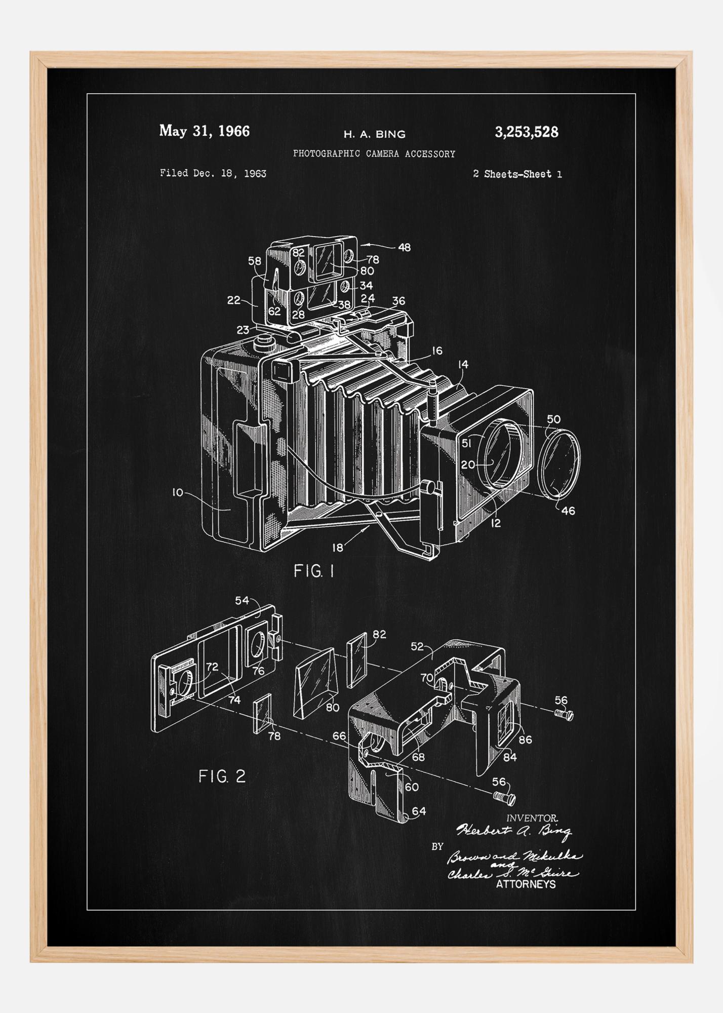 Denna sofistikerade patentposter med en svart tavla bakgrund ger en stark och stilren presentation av ett fotografiskt kameratillbehör, patentnummer 3,253,528, utfärdat den 31 maj 1966. Med sin skarpa vitlinjade illustration som framträder mot den mörka bakgrunden, erbjuder ritningen en detaljerad vy över en teknisk innovation som fört fotokonsten framåt. Patent affischen är en hyllning till den tid då fotografi började ta stora kliv i teknologisk utveckling.
