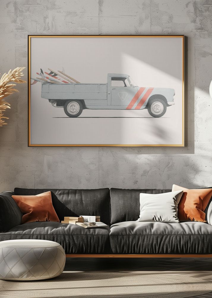 Denna stilrena poster framställer en klassisk pickup i en minimalistisk illustration som perfekt fångar essensen av frihet och äventyr på vägen. Med sin ljusgrå färg och subtila röda detaljer på sidan, är denna print ett idealiskt val för den som uppskattar vintagefordon och retroskönhet. Bakgrunden harmoniserar i en mjuk beige ton som framhäver bilens konturer och kontrasterar diskret mot de vitaktiga surfbrädorna på flaket.