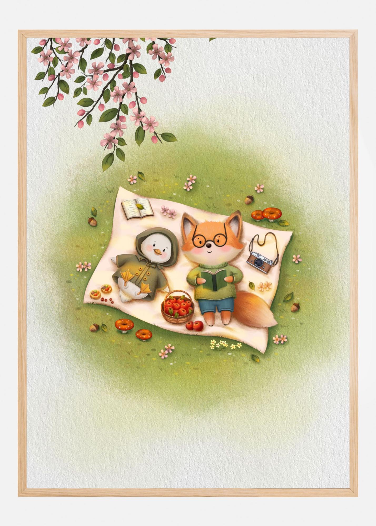 Denna förtjusande poster porträtterar en idyllisk och fantasifull scen där en bedårande räv tillsammans med en söt kanin tar del av en picknick under ett blommande träd. Den lekfulla illustrationen är fylld med varma färger och vänliga karaktärer, vilket skapar en mysig atmosfär som är perfekt för att lägga till en hemtrevlig känsla i varje rum. Motivet är rikt på detaljer som ett färgglatt fruktfat, korgar, en bok och färgsprakande blommor, vilket ger en berikande och inbjudande känsla.