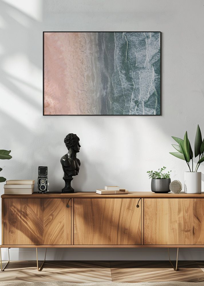 Denna fascinerande poster fångar ögonblicket där land möter hav i en harmonisk balans. Det vackra motivet visar en strand med varma nyanser av rosa och beige sand som mjukt övergår i de mörkblå och gröna tonerna av havsvågorna. Vågornas skumiga vita toppar ger en känsla av rörelse och liv, vilket ger postern en dynamisk och levande känsla.
