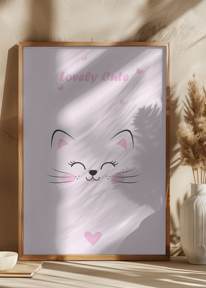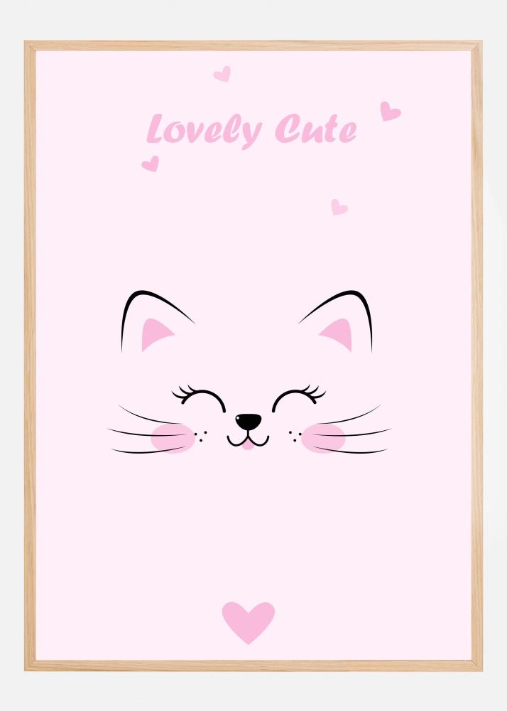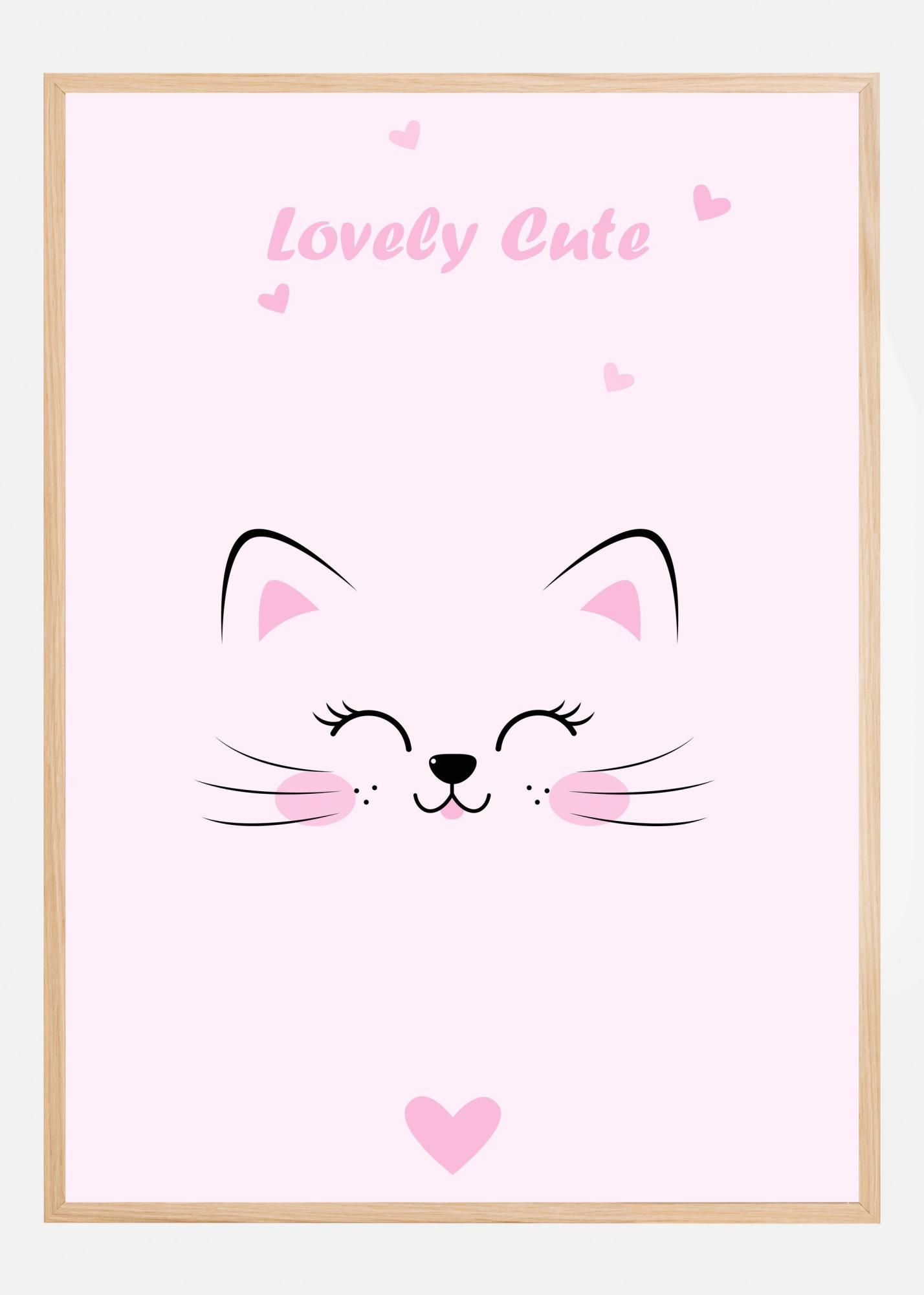 Printets enkelhet kompletteras av lekfulla element som små hjärtan och texten "Lovely Cute", vilket förhöjer den gulliga stilen. Denna affisch skulle passa perfekt i ett barnrum eller som en fin detalj i en annars minimalistiskt dekorerad yta. Med en dominerande färgpalett bestående av rosa, vit och subtila toner av grått och svart, är denna poster idealisk för den som önskar att föra in lite värme och charm i sitt hem.