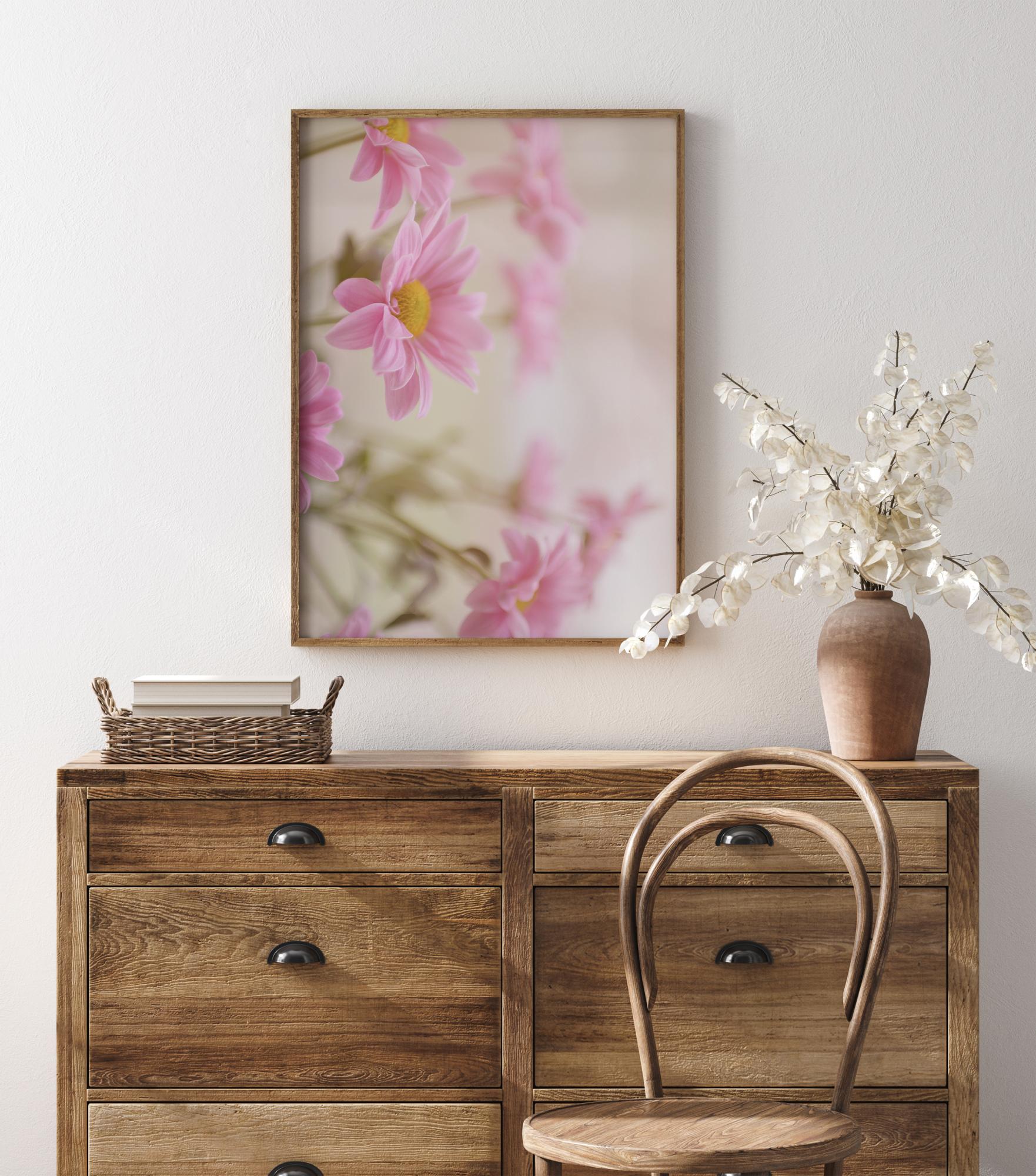 En närbildsposter med vackra rosa prästkragar. Mot en beigefärgad bakgrund skapar blommornas skönhet en glad och fridfull atmosfär. Med en ljusgul ståndare är detta det perfekta trycket för att skapa en fridfull och kärleksfull känsla.