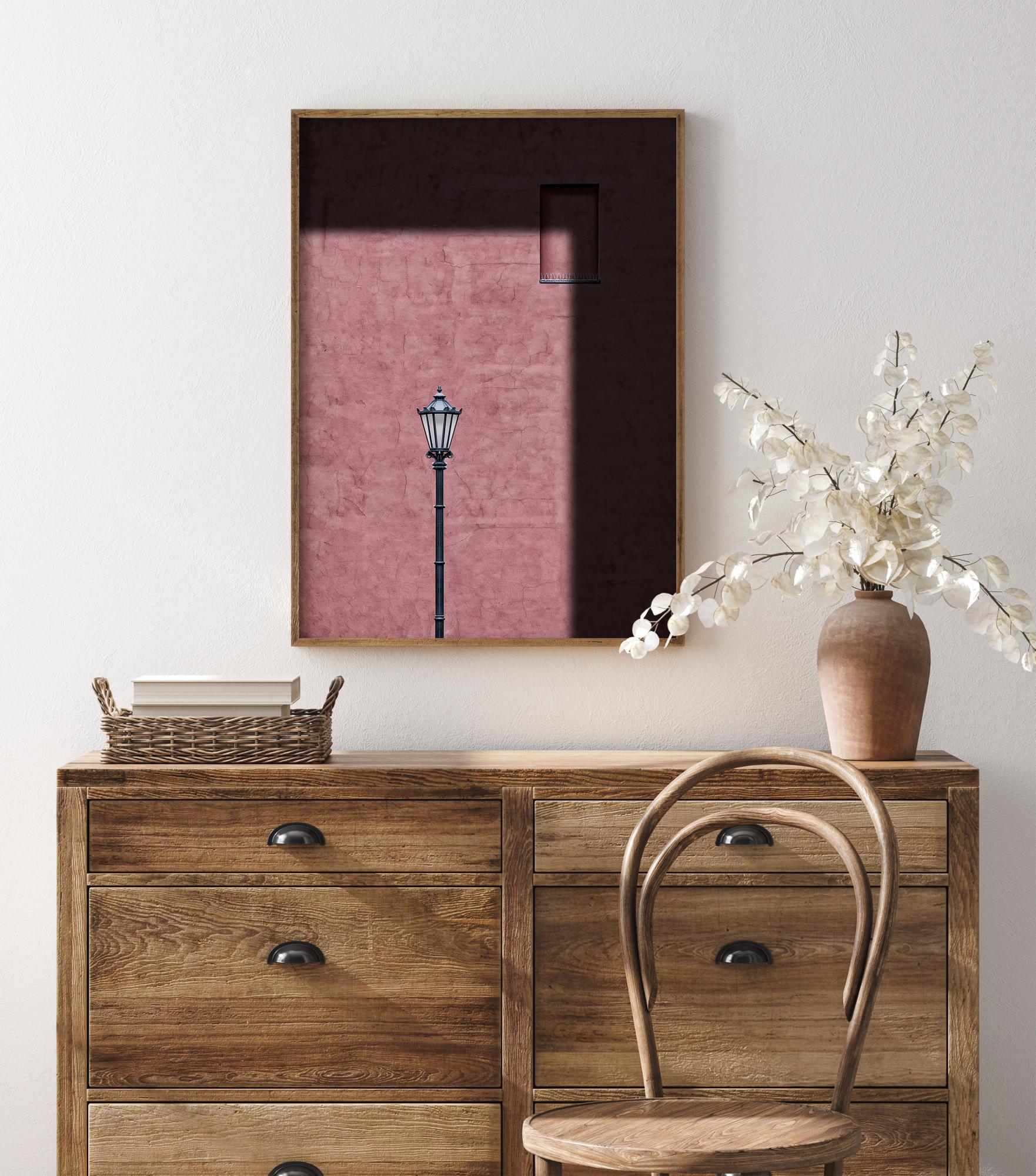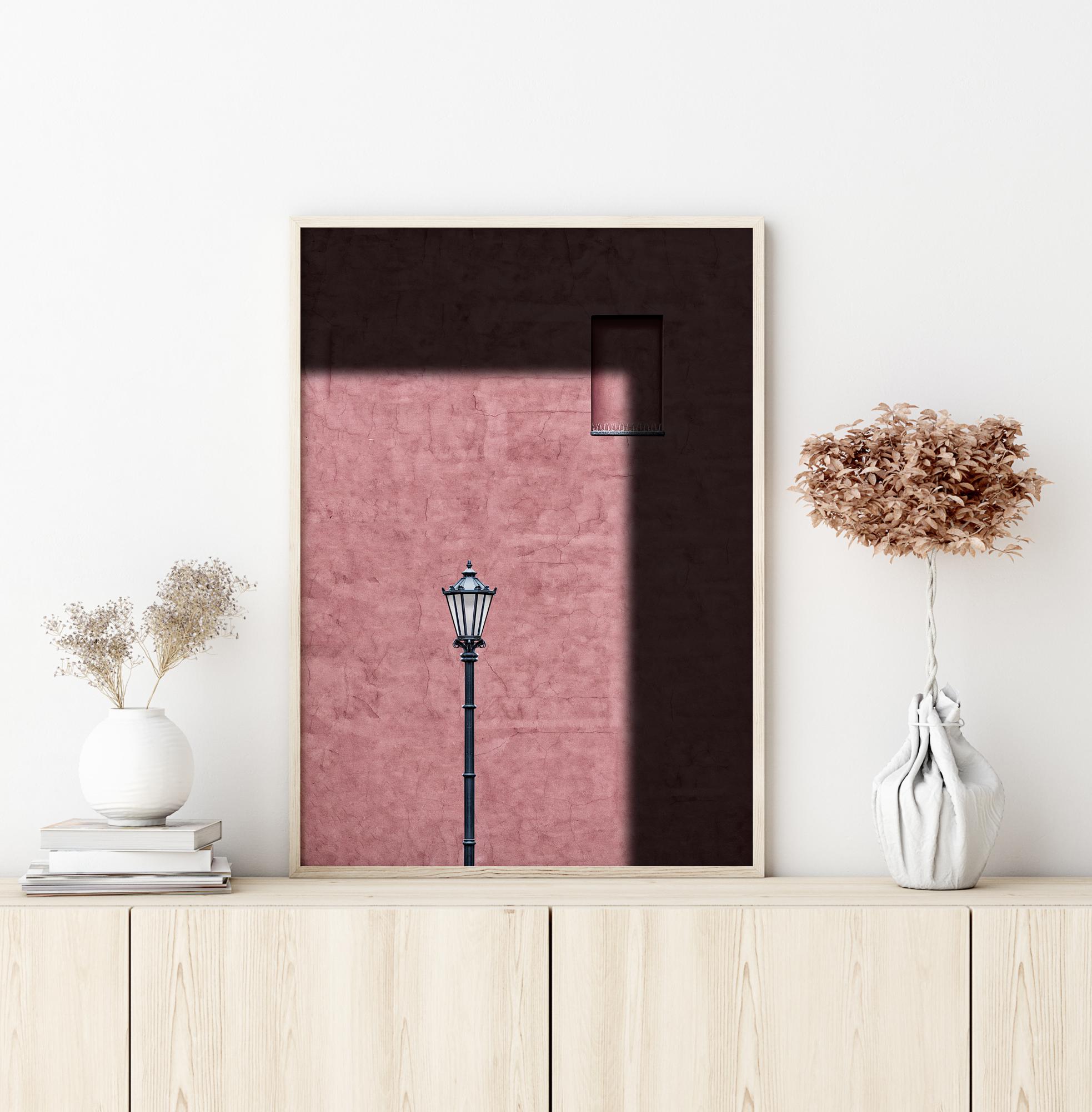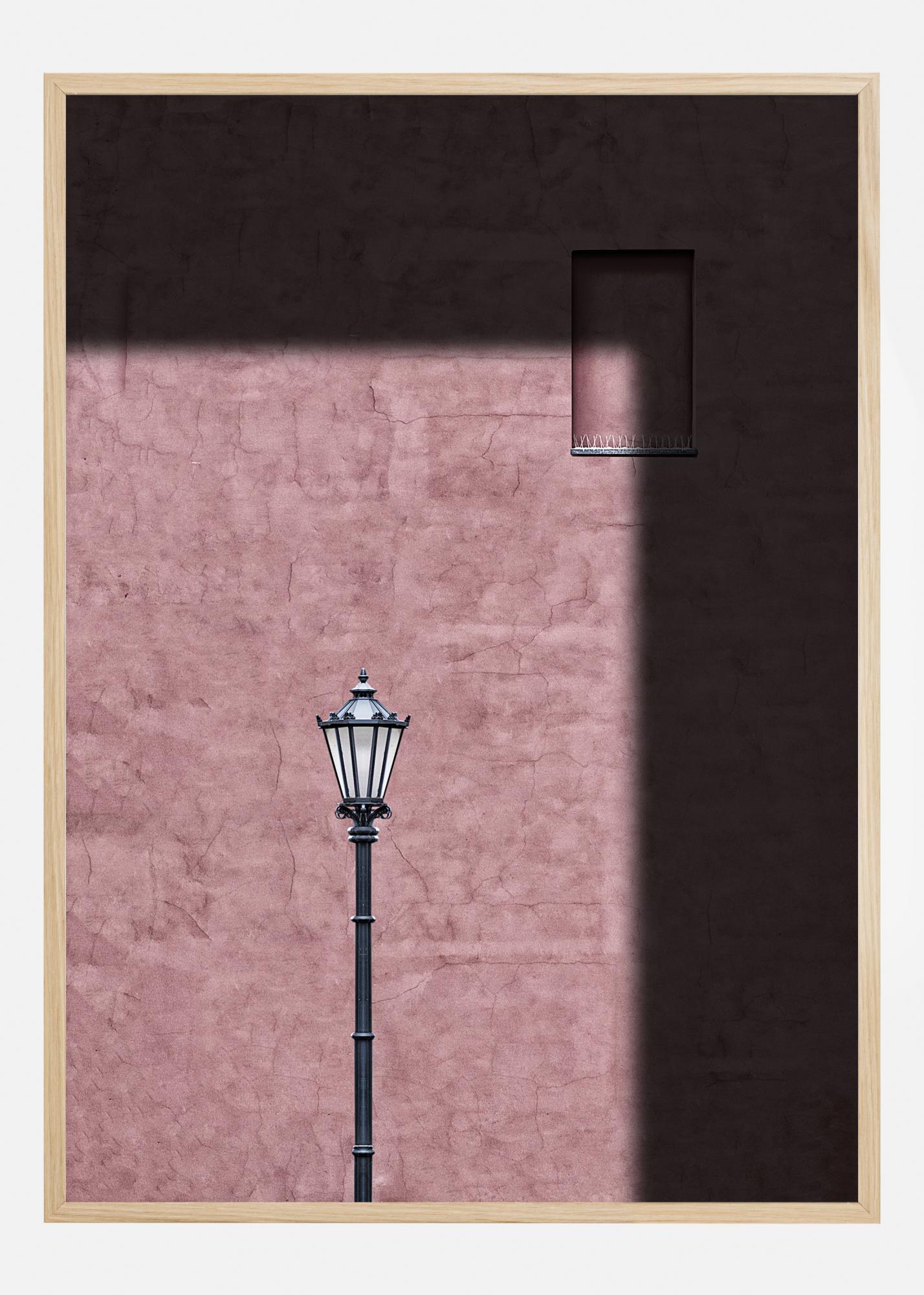 Ett färgstarkt tryck av en rosa fasad med en utomhuslampa placerad i mitten. Det naturliga solljuset lyser på väggen och lämnar den övre delen av postern i mörker. Ett litet murat fönster kan ses i det övre högra hörnet. Få in lite ljus i ditt hem med den här mjuka rosa postern.