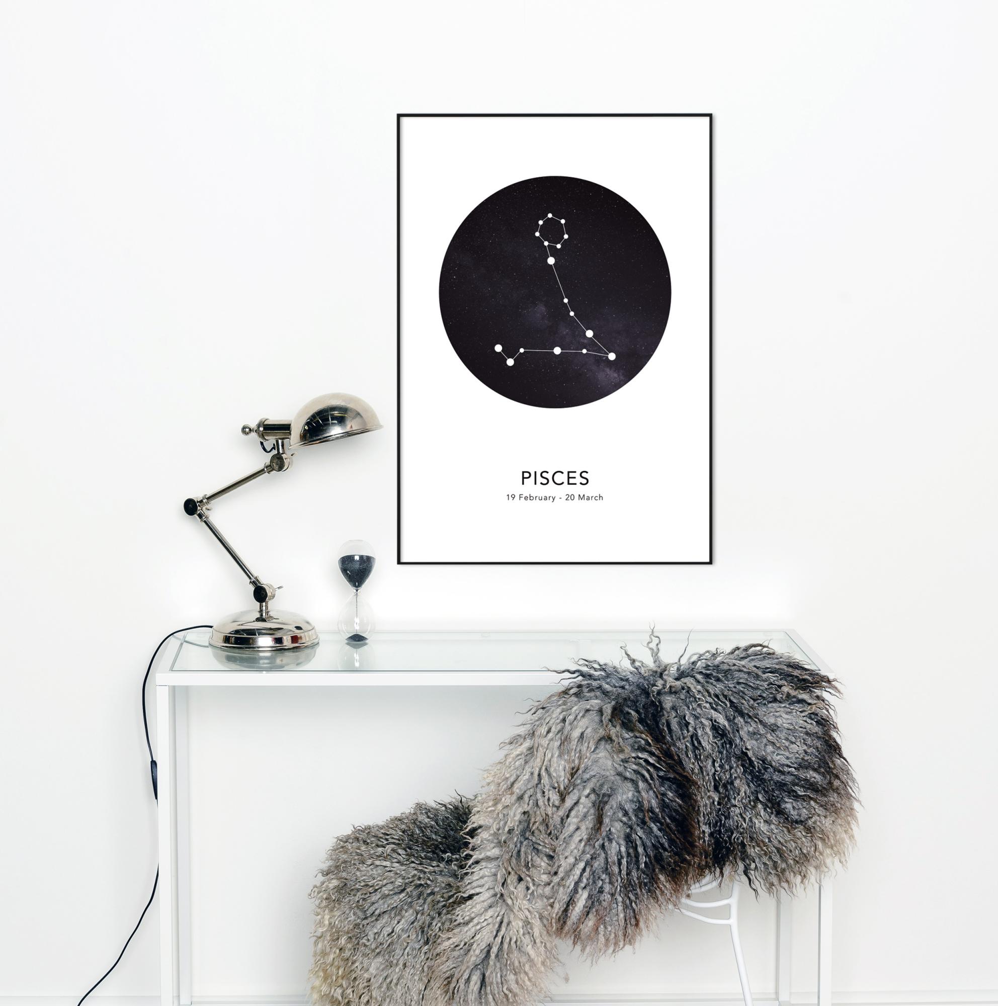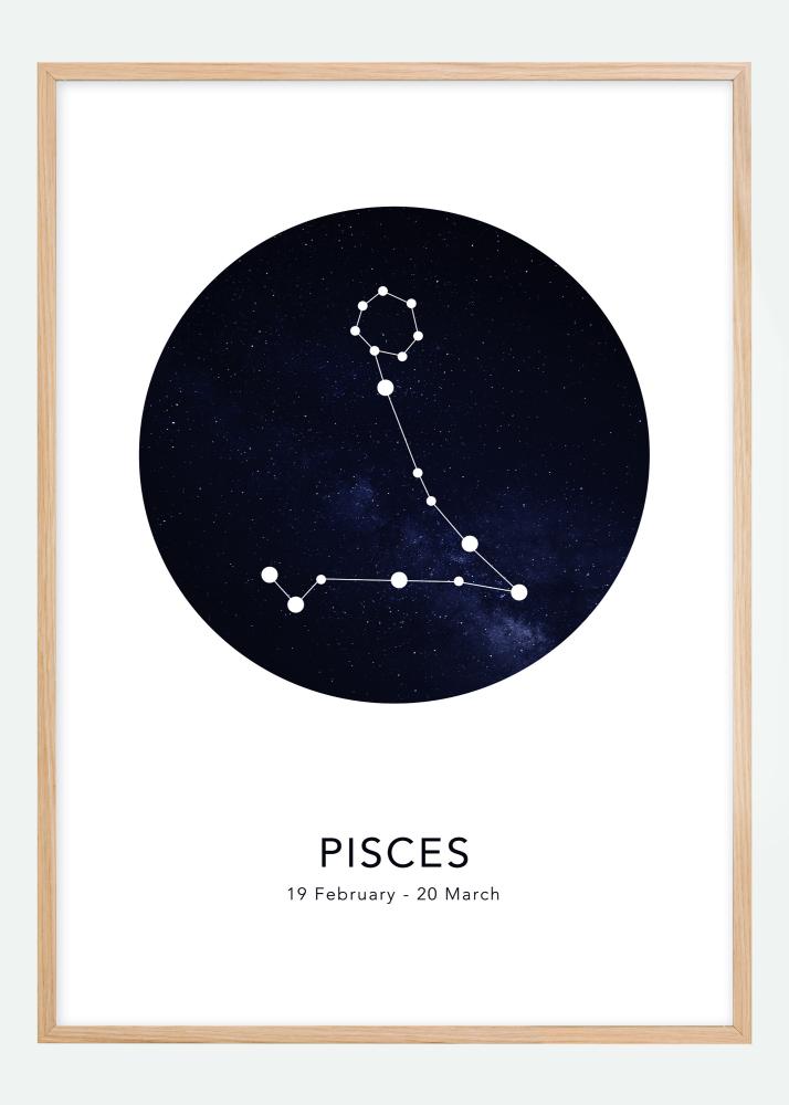 Ge bort en personlig tavla till någon som du tycker om! Den här stilsäkra planschen har motiv av stjärntecknet Fiskarna mot en bakgrund i form av en svart och blå stjärnhimmel. Nedanför finns namnet tillsammans med gällande datum på engelska.