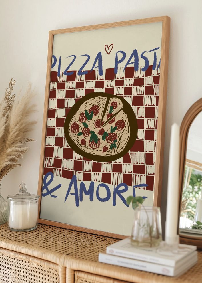 Färgerna i denna print inkluderar röda och vita rutmönster, en brun och beige nyans på pizzan samt olivgrönt på toppingen. Den blå texten ger en modern touch och skapar en lekfull kontrast. Denna dekorativa affisch är ett perfekt tillskott till köket eller matsalen och förmedlar en känsla av värme och gemenskap.