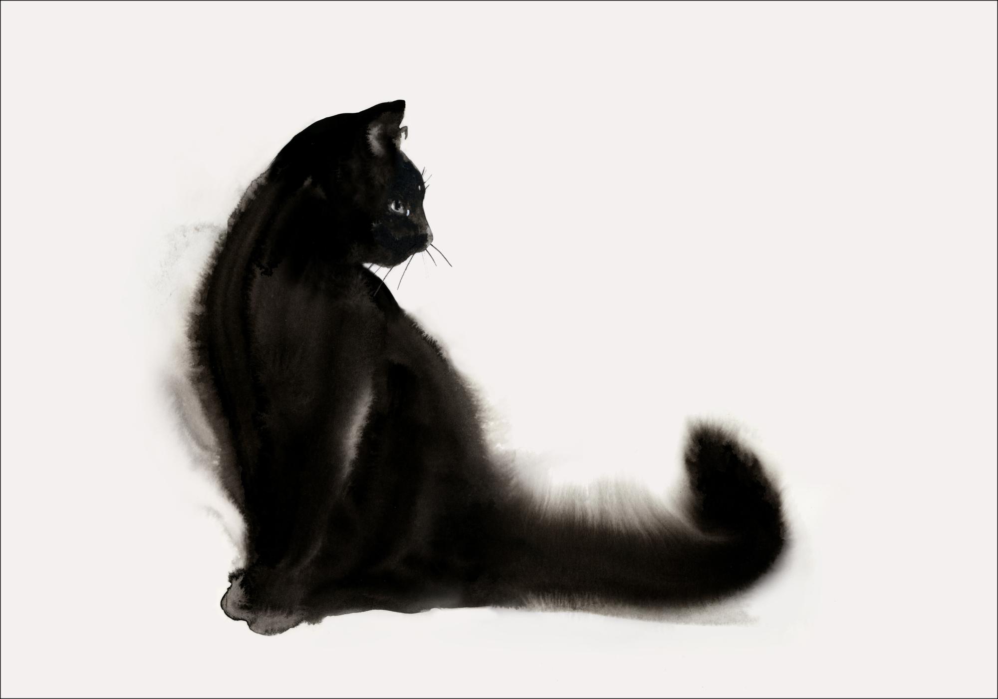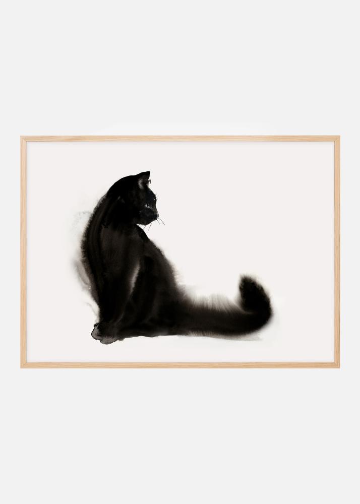Ett vackert tryck av en svart burmesisk katt. Mot en vit bakgrund tittar den svarta katten över axeln som om den observerar något. Det naturliga ljuset lyser på kattens framben och skapar en vit fläck. En fantastisk poster för kattälskare.