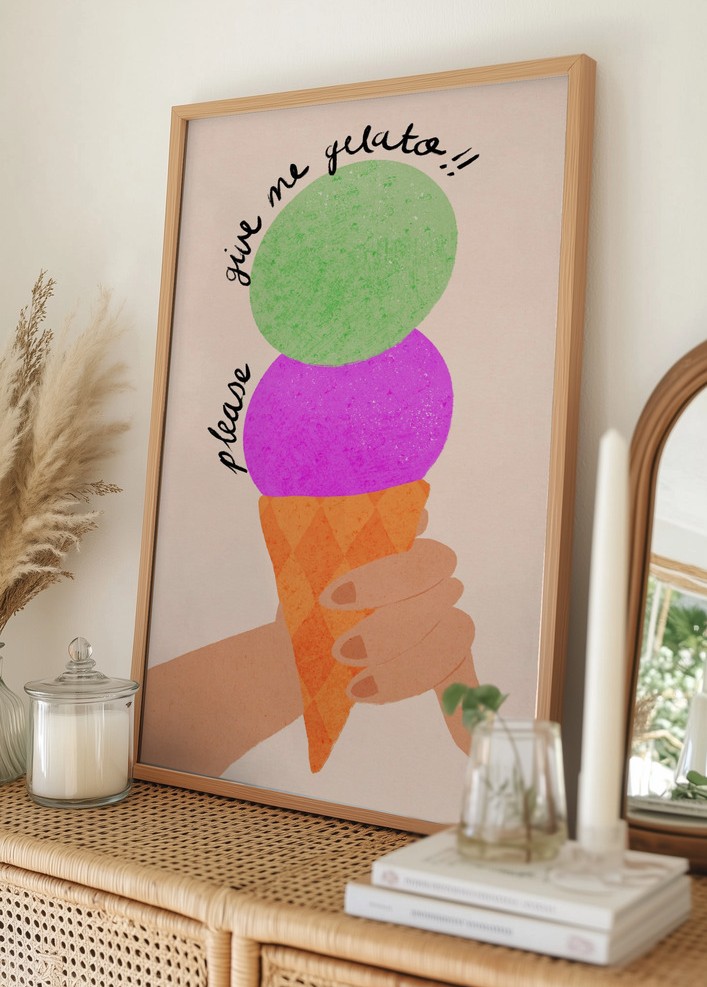 Denna livfulla och lekfulla poster är perfekt för att ge ditt hem en touch av sommar och glädje. Motivet visar en hand som håller en isig gelato i en klassisk strut, vilket ger en härlig nostalgisk känsla. Överst på glassen ser vi en uppfriskande grön kula, följd av en lila kula, vilket skapar ett färgstarkt och iögonfallande uttryck. Texten "please give me gelato!!" över motivet förstärker den lekfulla karaktären och lockar till leenden.