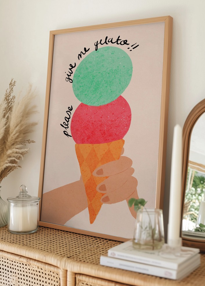 Denna affisch fångar sommarens fräscha glädje med en av en glass i strut. Motivet visar två kuler av glass i livfulla färger: en mintgrön kula överst och en rosaröd kula under. Den detaljeradestekniken ger en känsla av både kreativitet och lekfullhet, vilket gör den perfekt för att ge färg och humor åt vilket rum som helst. Texten "please give me gelato!" ger postern en charmig och inbjudande karaktär, som för tankarna till härliga sommardagar.