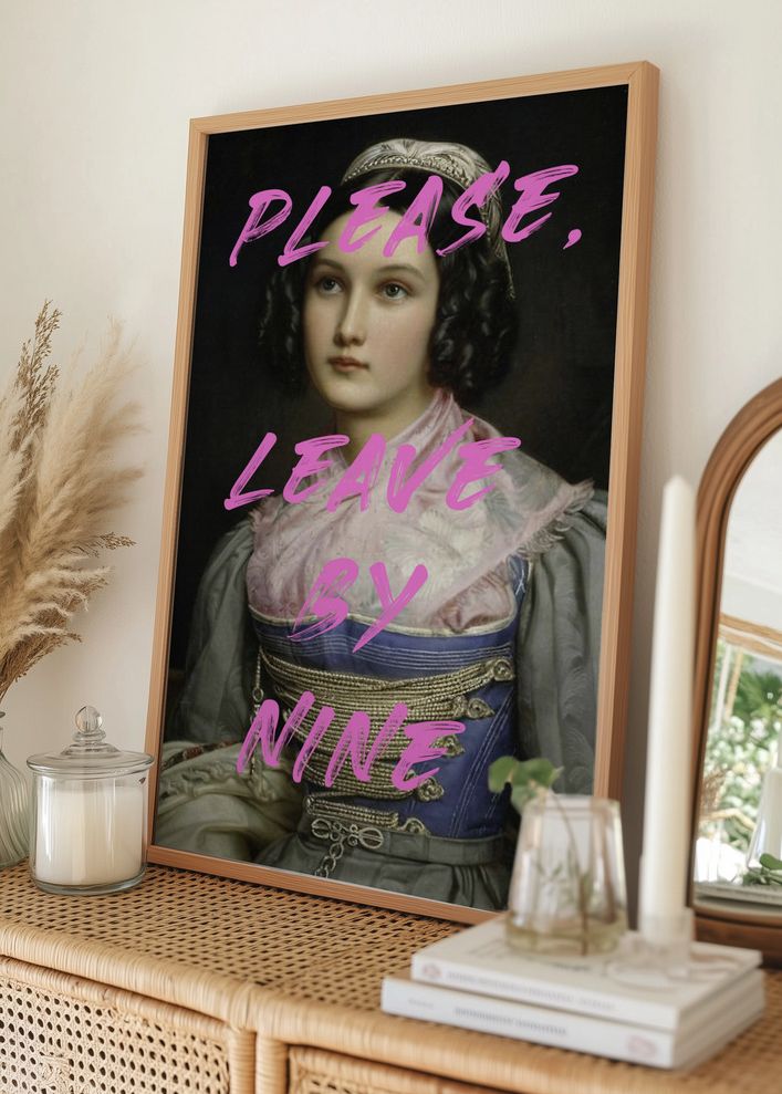 Denna poster förenar det traditionella med det moderna och är perfekt för den stilmedvetna inredningen. Motivet visar en ung kvinna i klassisk klädsel, men med en twist – iögonfallande rosa text tvärs över bilden som lyder "PLEASE, LEAVE BY NINE". Detta ger affischen en humoristisk och samtida touch, vilket gör den till ett samtalsämne i vilket rum den än hänger.