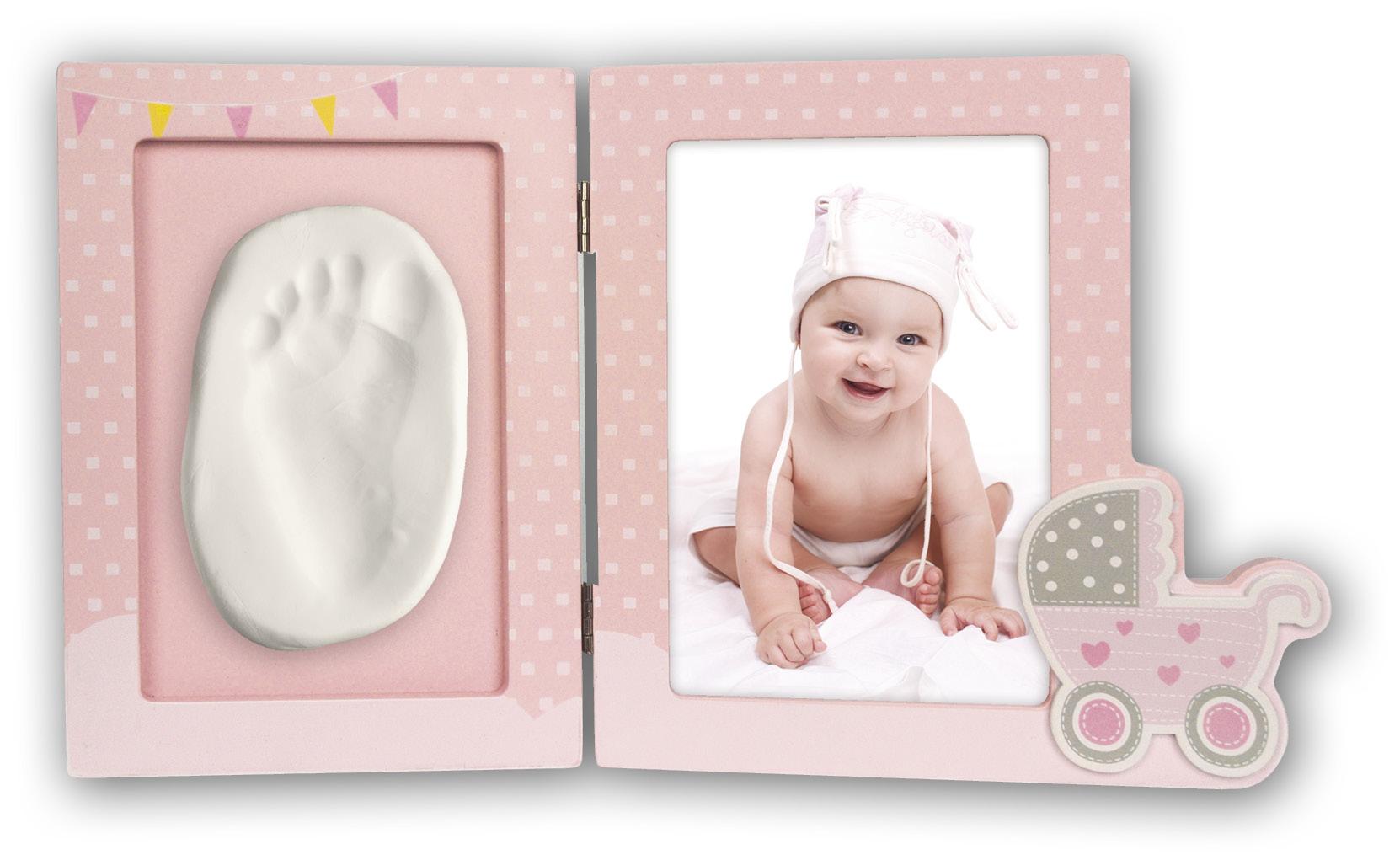 Ge bort den sötaste presenten på babyshowern eller dopet! Den här rosa vikramen har 2 bildöppningar varav 1 som du kan välja att sätta ett litet hand- eller fotavtryck i. Ramen är ljust mönstrad, har rosa och gula vimplar i ett av de övre hörnen samt en utstickande barnvagn i ett av de nedre hörnen. Medföljer gör ett gipskit som du använder till hand- eller fotavtrycket.
