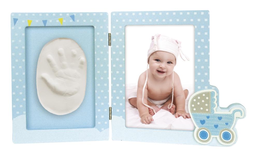 Ge bort den sötaste presenten på babyshowern eller dopet! Den här ljusblå vikramen har 2 bildöppningar varav 1 som du kan välja att sätta ett litet hand- eller fotavtryck i. Ramen är ljust mönstrad, har blå och gula vimplar i ett av de övre hörnen samt en utstickande barnvagn i ett av de nedre hörnen. Medföljer gör ett gipskit som du använder till hand- eller fotavtrycket.