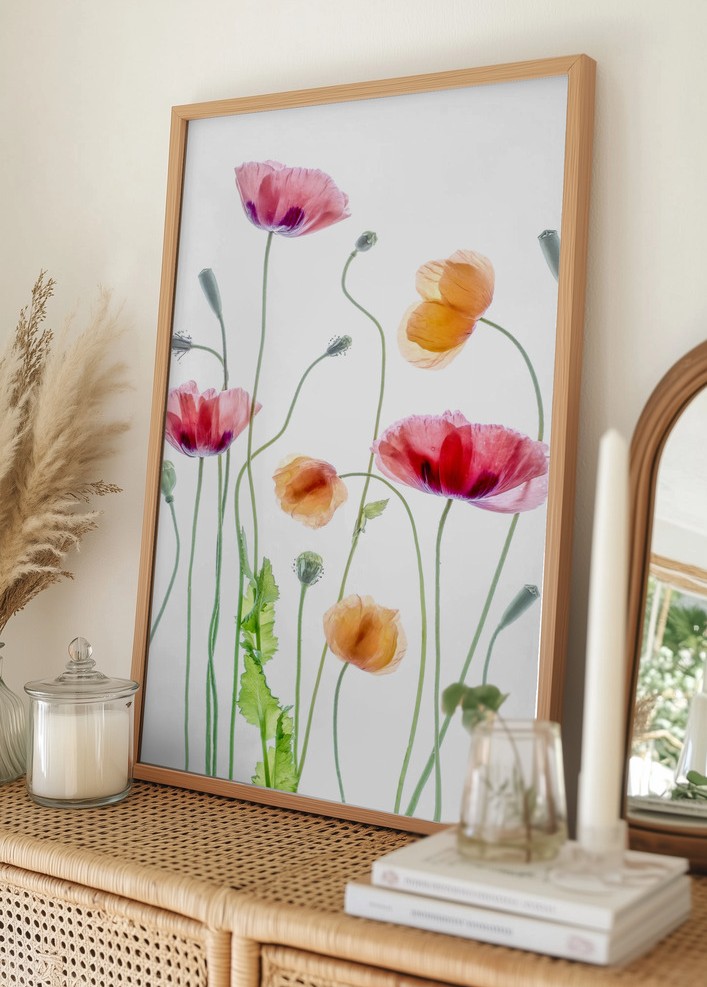Färgpaletten i affischen består av nyanser av rosa, rött, orange och grönt, vilka kompletterar varandra och skapar ett fridfullt men ändå energiskt uttryck. De långa, tunna stjälkarna och knopparna ger en subtil konstnärlig touch som förhöjer motivets visuella intresse. Denna poster är idealisk för att ge en modern och sofistikerad känsla till ditt hem eller arbetsutrymme.