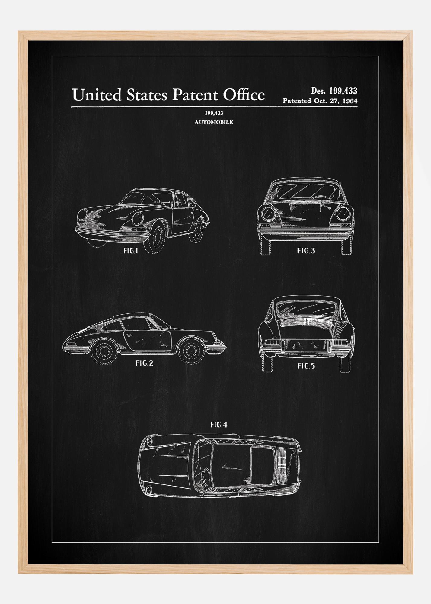 Kontrasten mellan det svarta bakgrunden och de vitlinjerade ritningarna skapar en dramatisk och modern känsla som lyfter fram varje kurva och detalj av bilens design. Detta gör den till en iögonfallande och sofistikerad väggdekoration i alla utrymmen, från vardagsrum till kontor eller garage. Denna patent affisch förenar konst och innovation, och den är säker på att inspirera och imponera på alla som ser den.