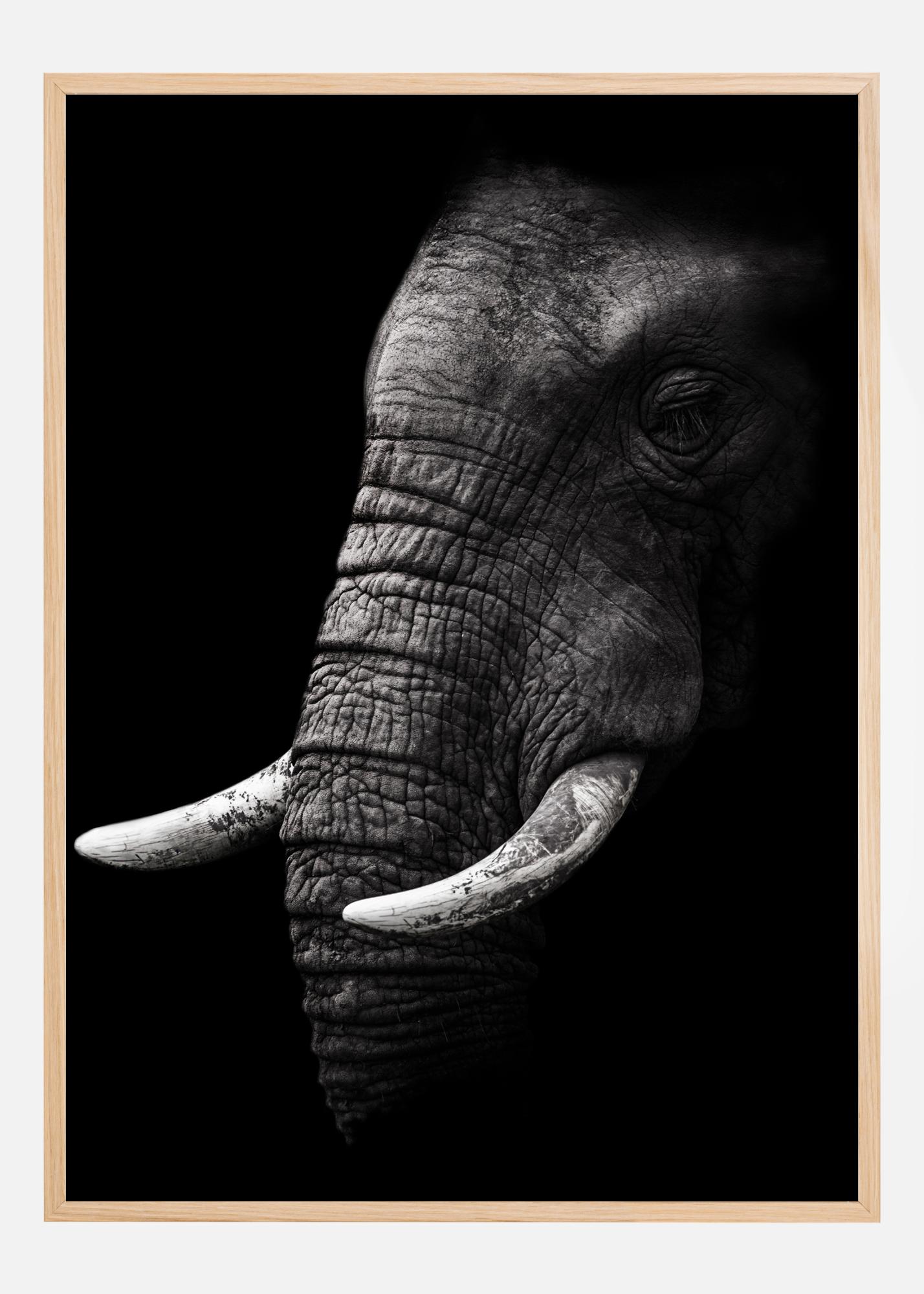Ett fantastiskt svartvitt tryck av ett elefanthuvud. Den svarta bakgrunden framhäver de små elefantbetarna. Med sin lilla skrynkliga snabel och slutna ögon är bilden en stilren representation av elefantens skönhet. En idealisk poster för djurälskare.