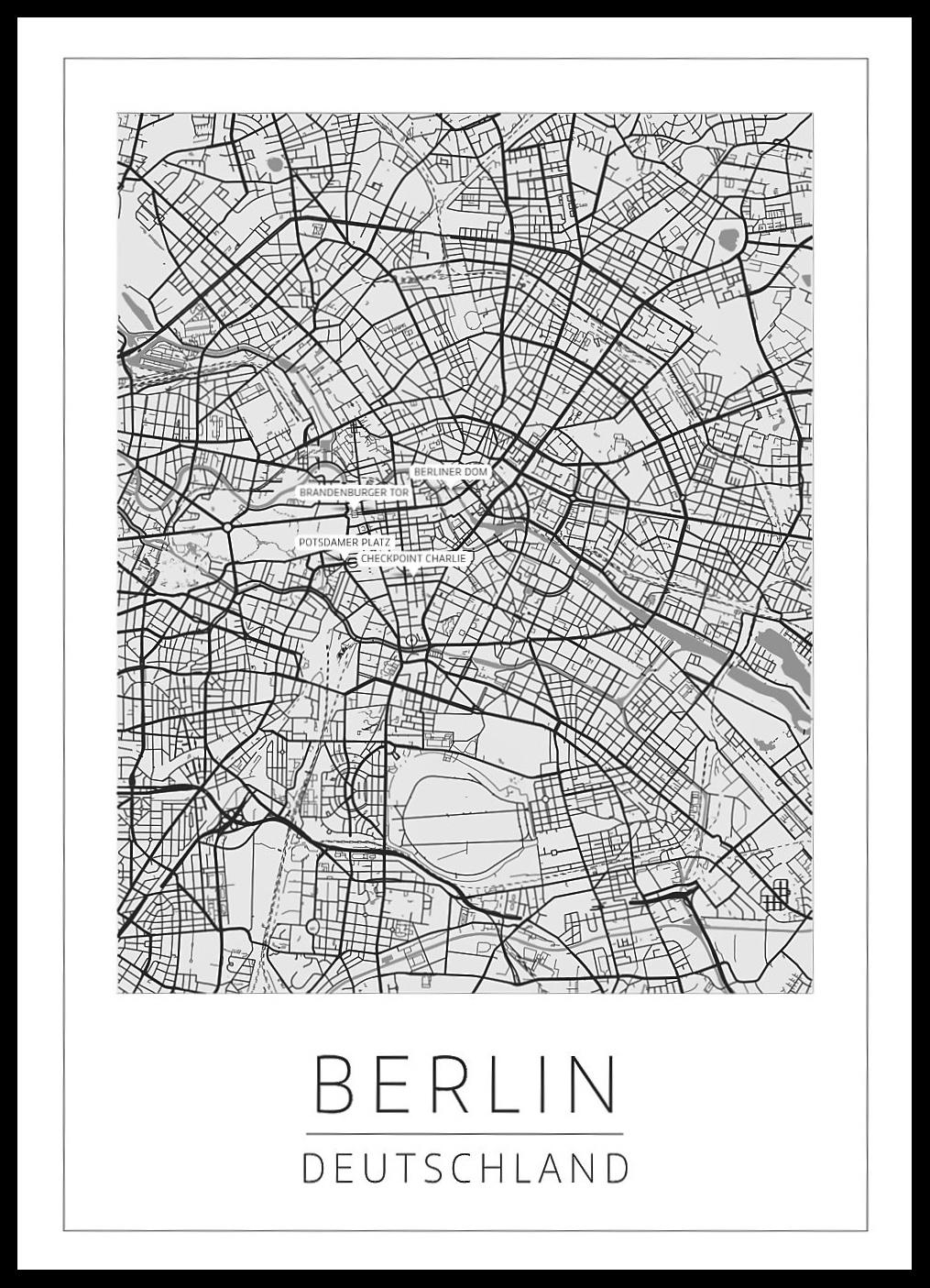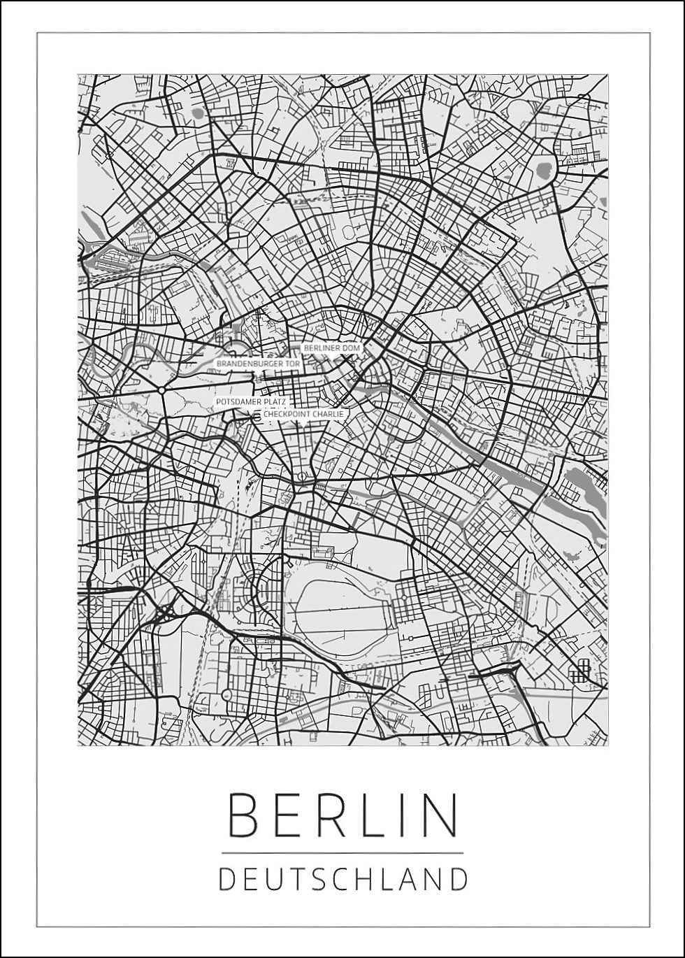 Har Berlin en särskild plats i ditt hjärta? Dekorera väggen med en snygg karta över storstaden! Denna poster är svartvit och har texten "Berlin, Deutschland" tryckt med ett stilrent och mjukt typsnitt. Komplettera med en svart ram eller fånga Berlins konstnärliga sida med en färgstark. Välj gärna till en vit passepartout för en extra lyxig känsla.