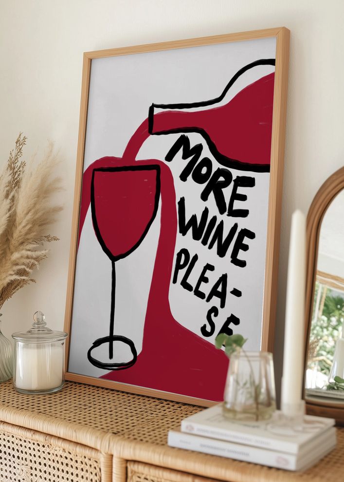 Denna moderna affisch fångar ögat med sina djärva och minimalistiska linjer. Motivet visar en stiliserad vinflaska som häller vin i ett glas, åtföljt av texten "More Wine Please". Dess enkla formspråk och lekfulla text gör denna poster till ett perfekt tillskott i köket eller hemmabaren.