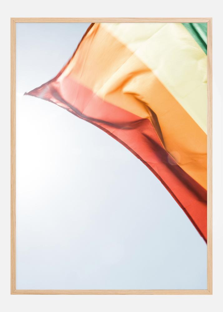 Ett symboliskt tryck av en flagga mot en grå bakgrund. Placerad i den övre halvan av trycket blåser flaggan försiktigt i vinden. De röda, orange, gula och gröna ränderna är arrangerade horisontellt på flaggan. En färgstark poster som lyser upp vilken bar vägg som helst.