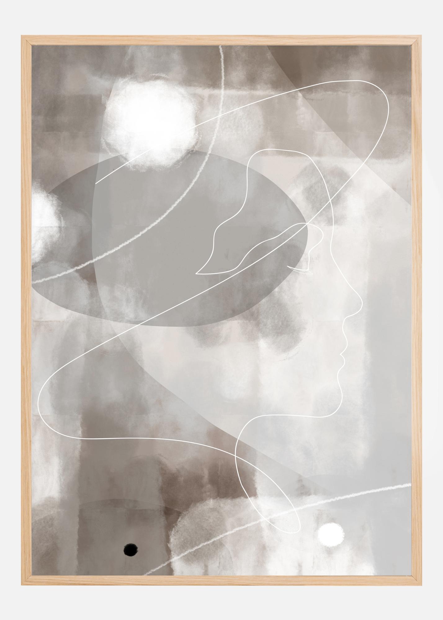 Ett konstverk som illustrerar en kvinna som bär en hatt. Det här vackra profiltrycket har skickligt ritats utan att någonsin lyfta penseln från trycket. Kvinnans kontur är placerad mot en ljusbrun bakgrund med några vita moln i den övre delen av trycket. En vacker poster för en kvinnas sovrum.