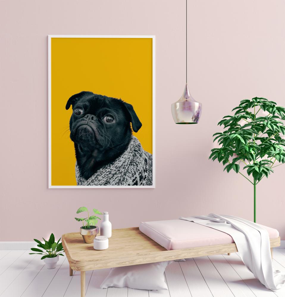 I en stickad tröja och mot en skarpt gul bagrund, posar en svart mops med sin härliga uppsyn. En charmig och attitydfull poster för den som älskar mopsar!