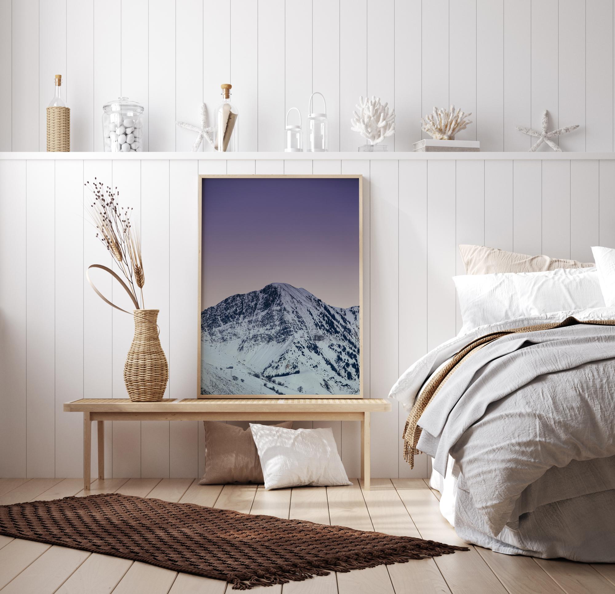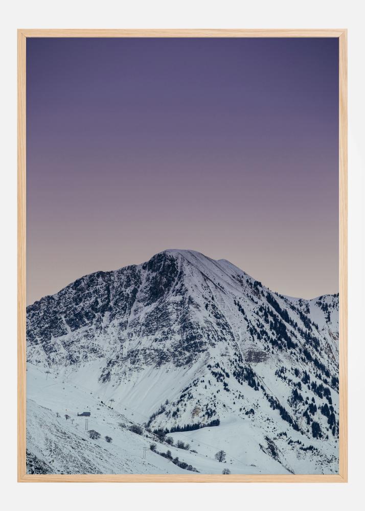 En stjärnklar nattposter över ett massivt vitt berg. Detta imponerande snötäckta berg är placerad under en fantastisk lila himmel. Den lila himlen reflekteras på bergstopparna och skapar en varm känsla i trycket. En vacker bild att hänga i en kall miljö.