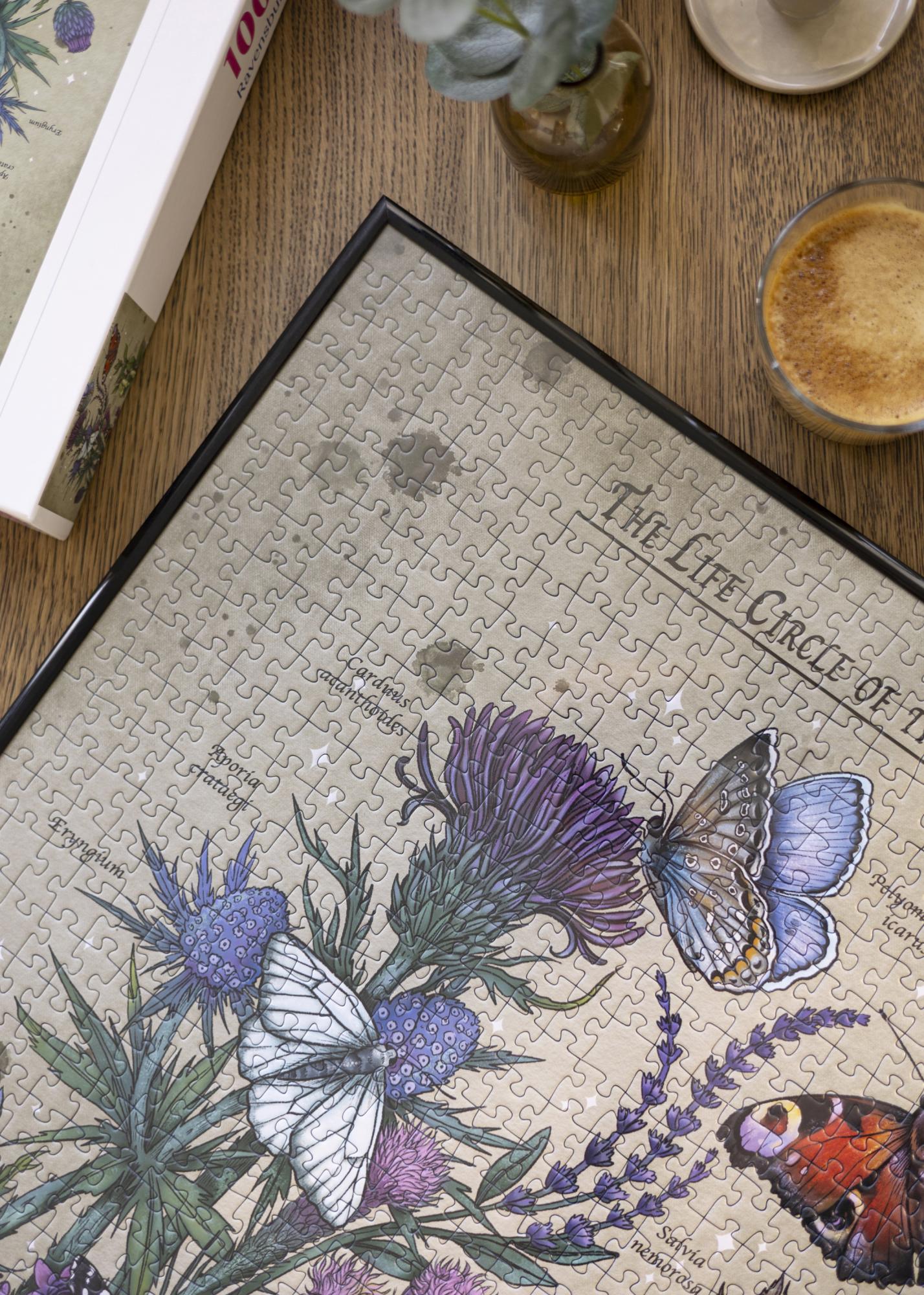 Den svarta ramen ger en neutral inramning som låter pusslets detaljer framträda.